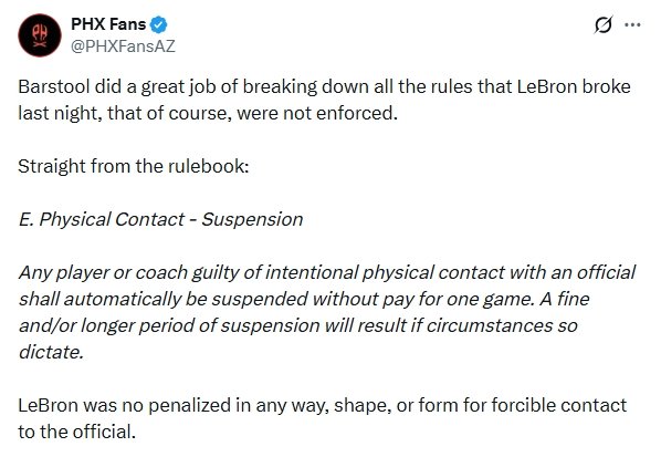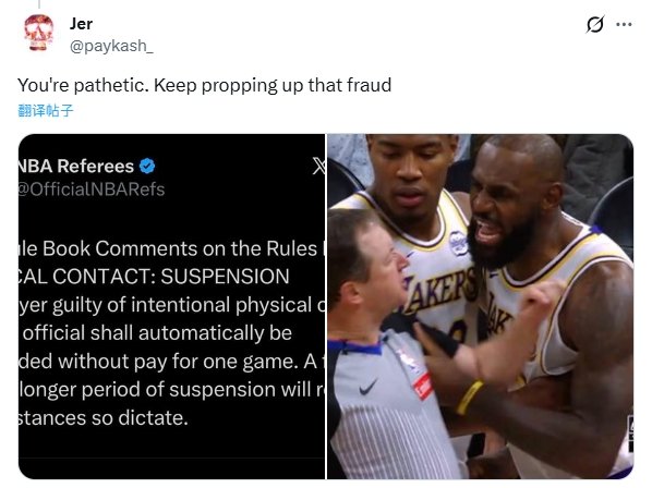 詹姆斯拉扯裁判没有任何处罚!太阳博主晒规则原文鸣不平:可悲!比赛第三节10分47秒时,勒布朗·詹姆斯因对狄龙·布鲁克斯死球时触球感到不满,直接撞击后者胸口。随后裁判及时制止了事态恶化。但詹姆斯情绪激动,抓着裁判左手进行理论。最终,詹姆斯因撞击狄龙吃到一记技术犯规。詹姆斯暴怒,抓着裁判左手索要说法赛后,太阳博主晒出了NBA规则,抗议詹姆斯与裁判接触的行为。任何球员或教练员若被判定故意与裁判发生身体接触,将自动被处以无薪停赛一场的处罚。若情况需要,还可能追加罚款和/或更长时间的停赛。太阳博主:“真可悲。继续支持那个骗子吧。”太阳博主:“詹姆斯故意与裁判发生接触但没有受到任何处罚。”昨日赛后,太阳记者Duane Rankin向今日主裁泰勒·福特问及了该回合:问:第三节詹姆斯与裁判发生了明显的身体接触,当时有回看这个动作吗?答:即时回放里,我们会回看所有的违反体育道德的动作。当时与裁判的身体接触中没有违反体育道德的动作。赛后,NBA官方并没有对詹姆斯该行为进行任何处罚。