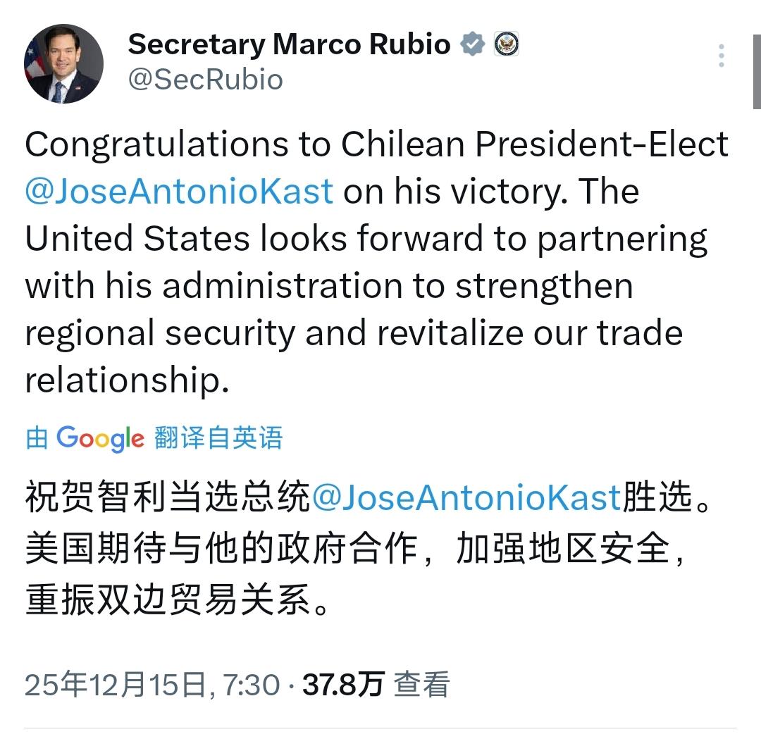 智利变天,美国国务卿祝贺智利新当选总统。美国国务卿鲁比奥今天(北京时间12月15日)发文写道:“祝贺智利当选总统何塞·安东尼奥·卡斯特胜选。美国期待与他的政府合作,加强地区安全,重振双边贸易关系。” 鲁比奥这祝贺比快递还快,说白了就是奔着智利的锂矿铜矿山来的!想把卡斯特绑上美国战车,挤走中国资本,真当中国在南美这些年的布局是纸糊的? 卡斯特别玩 “安全靠美、挣钱靠中” 的小把戏!中国是你家铜锂最大买家,真敢给中企设限,美国能填得上千亿市场的坑?小心两边都没讨到好,砸了自己的饭碗。 美国哪是来帮智利的,分明是趁火打劫抢资源!搞个 “矿产北约” 还不够,又盯着智利这块肥肉,鲁比奥的甜言蜜语里全是算计,就想断中国新能源的后路。 以前喊着对华合作的是卡斯特,现在要抱美国大腿的也是他!别拿 “国家安全” 当遮羞布,稀释中国影响力的背后,不过是想拿国家资源换美国的政治背书。 中智合作给智利建光伏、铺电网是实打实的好处,美国除了画饼还会啥?鲁比奥急着拉拢卡斯特,本质是怕中国在南美站稳脚,这霸权心思藏都藏不住。