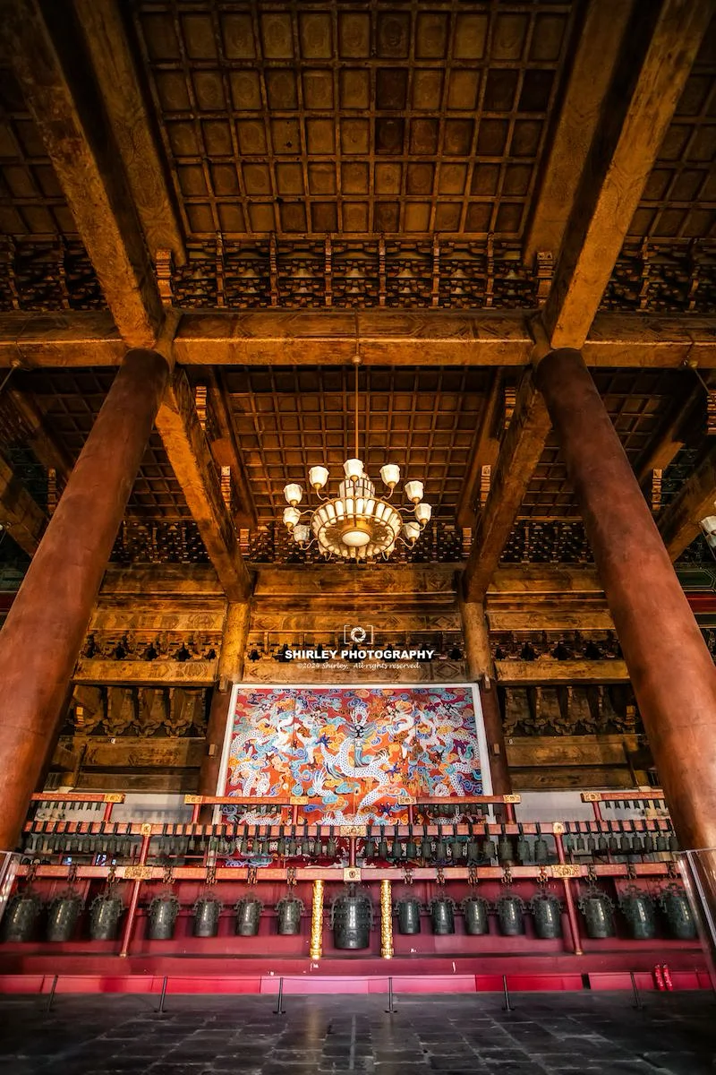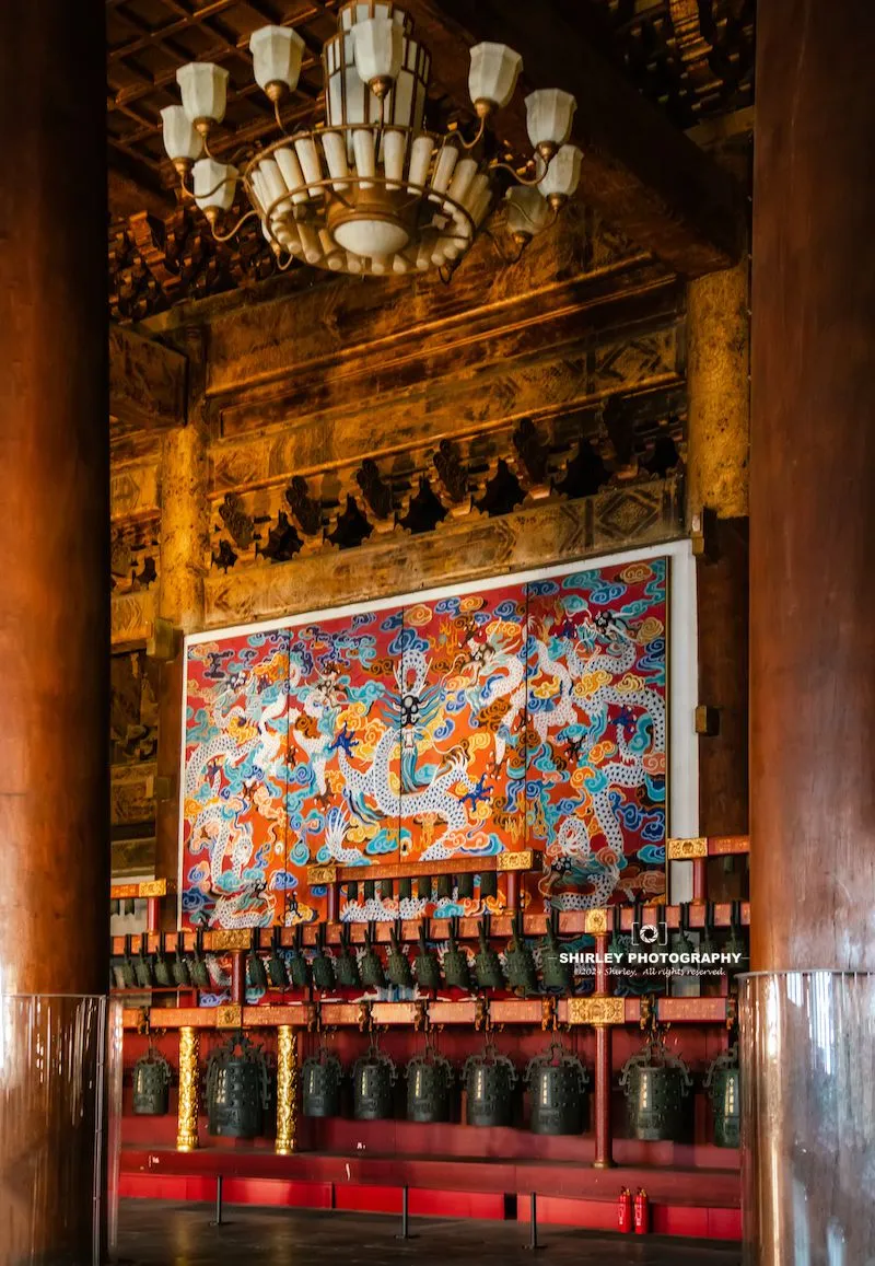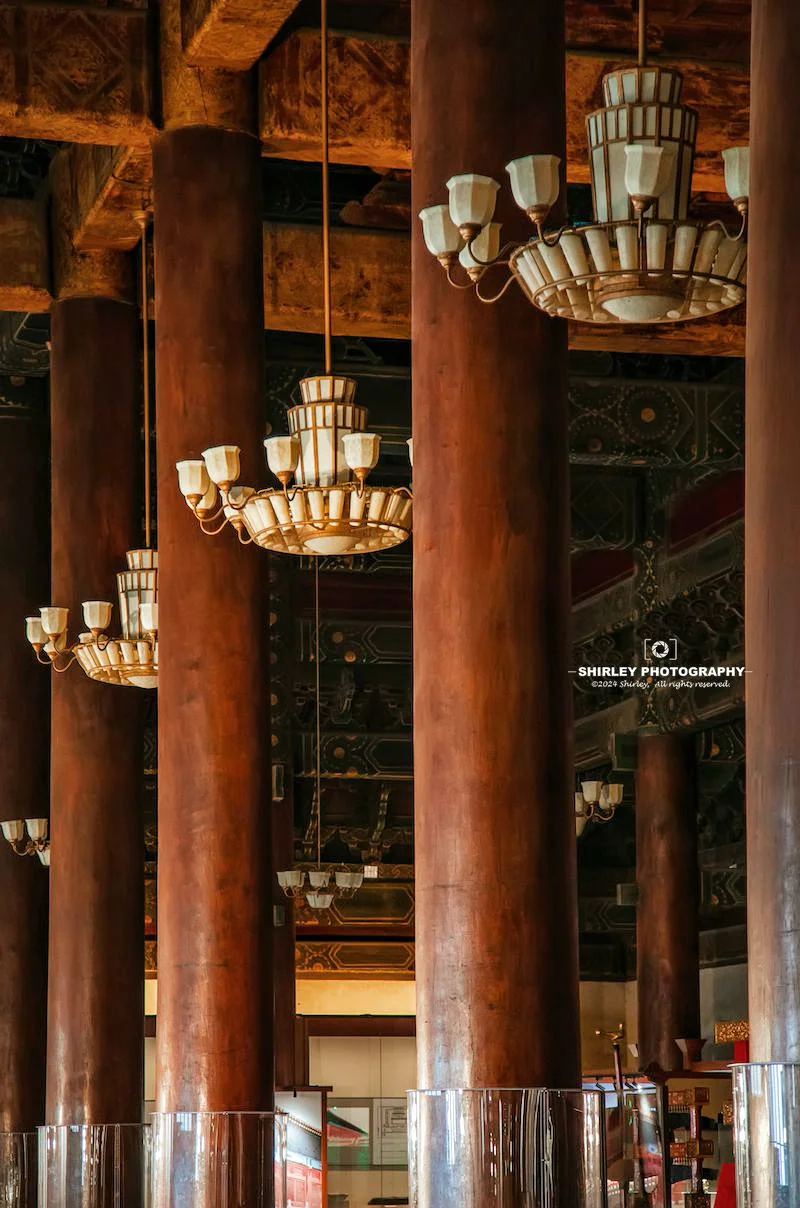 ▫️殿内金砖漫地,殿顶用沥粉贴金彩画天花装饰,最弹眼落睛的就是那68根粗壮高耸的楠木巨柱,撑起宏大宽广的室内空间。每根柱子高约13米,直径逾1米,最粗一根为1.2米,冠绝北京现存古建。