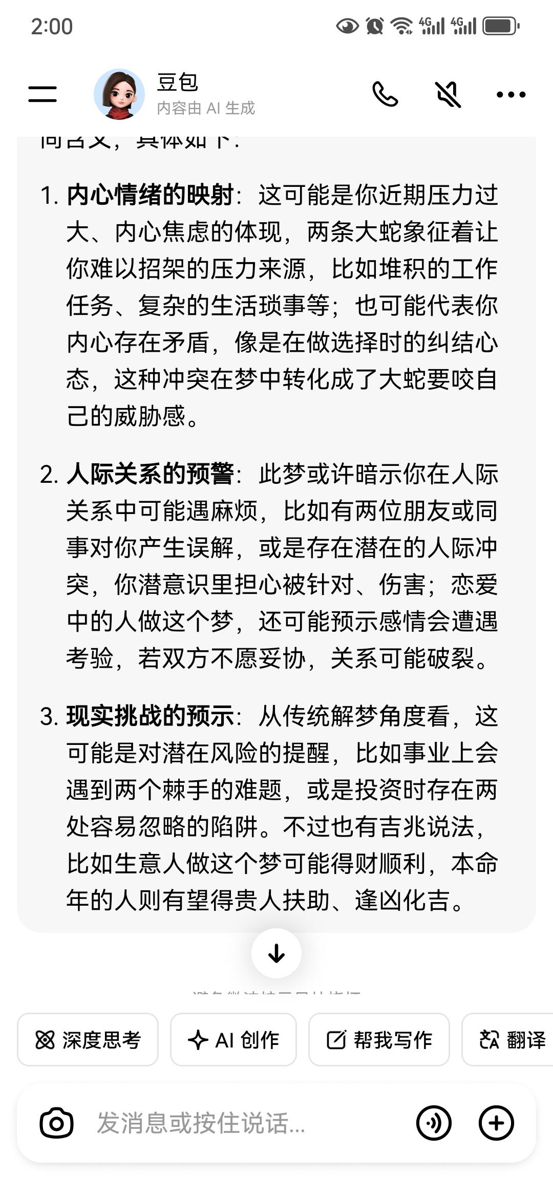 夸夸我的亲姐姐 我上次出了车祸, 姐姐从武汉来看望我, 偷偷放了2000块钱在枕头底下, 我一直想着收起来, 又一直忘记收起来, 刚才刷到条友文章看到红钞票, 我才想起来枕头底下有2000块钱。 昨晚上做噩梦, 梦到两条比胳膊大的蛇吐着信子, 在蚊帐外想攻击我, 我姐徒手抓住大蛇, 和姐夫一起把两条蛇给咔嚓了。 我早上问豆包, 梦到两条大蛇代表什么? ……(如下图) 我在梦里遇到危险, 来救我的是姐姐, 不是老公, 不是儿女, 不是我爸爸, 不是我哥哥和妹妹, 是我的亲姐姐。 自从我妈去世后, 长姐如母, 她负责安抚我和妹妹情绪, 从中调解兄妹之间的矛盾。 我姐脾气很好, 人很能干,乐观坚强, 无论遇到什么困难, 她都会积极面对, 从不退缩,迎难而上, 姐姐身上有一种百折不挠的精神。 前些年, 我爸摔伤了臀部, 卧床近3个月, 我姐千里迢迢 从武汉到浙江照顾我爸。 我爸因为一直躺着, 不能下床很难受, 天天朝我姐发脾气, 我姐含着眼泪忍了下来。 上次儿子感冒咳嗽厉害, 我跟姐姐简单说了一声, 她立马用快递寄了一箱子儿童药品。 我姐为人很实在, 她没有我哥有钱, 也没有我妹有钱, 但对我永远真心实意, 希望我姐身体健康, 笑口常开,家庭和谐,儿女成才! 你们有这样的好姐姐吗? 分享每日的感悟 训练营第二周奖励到账30块钱,你们收到没有?