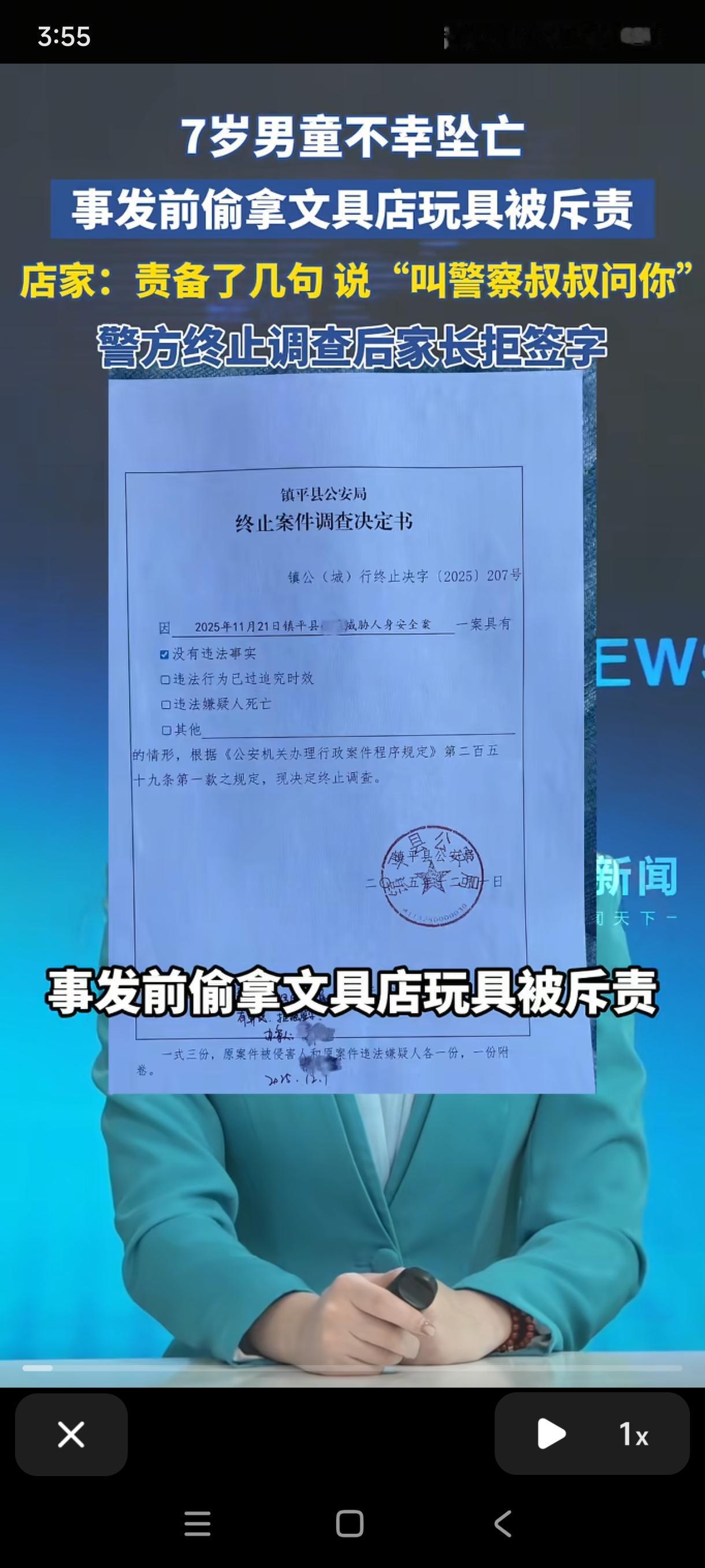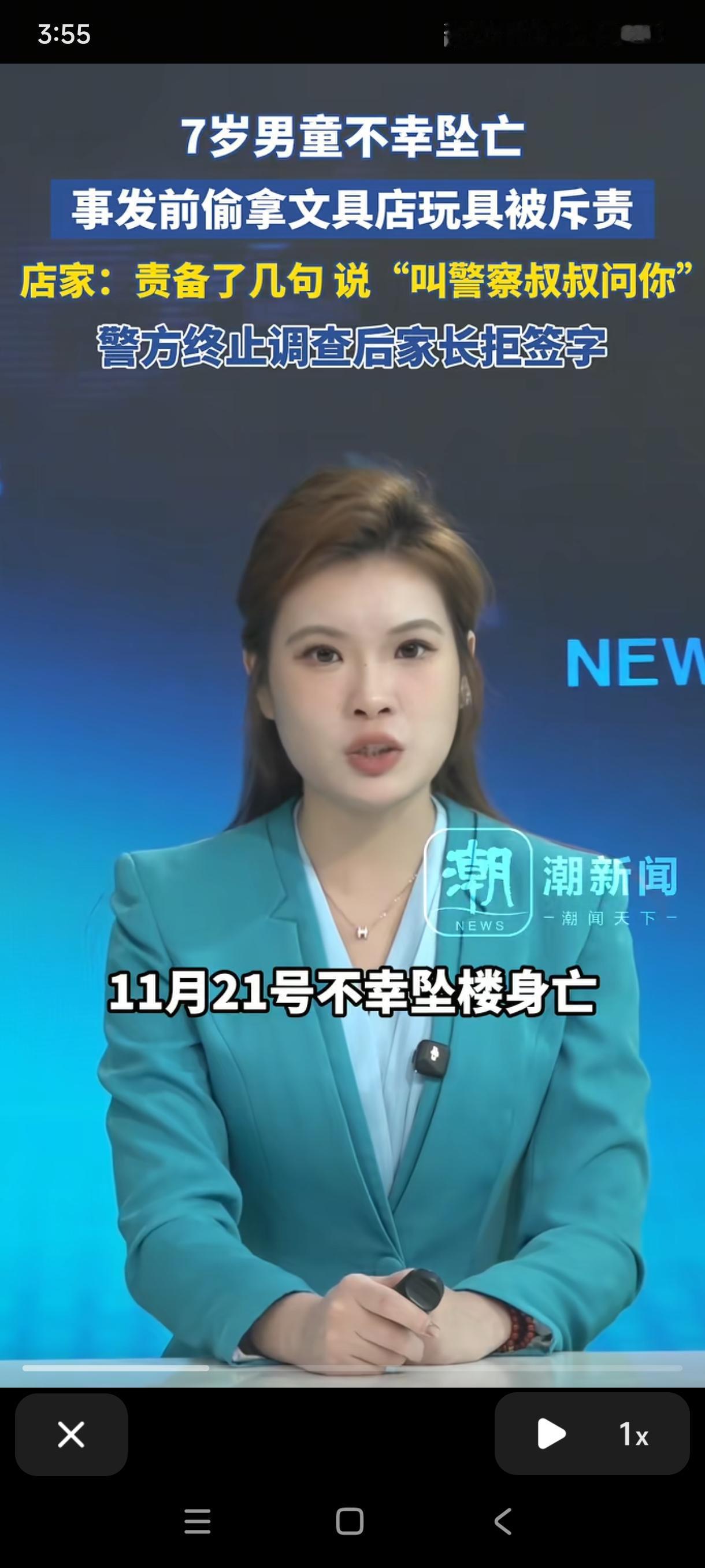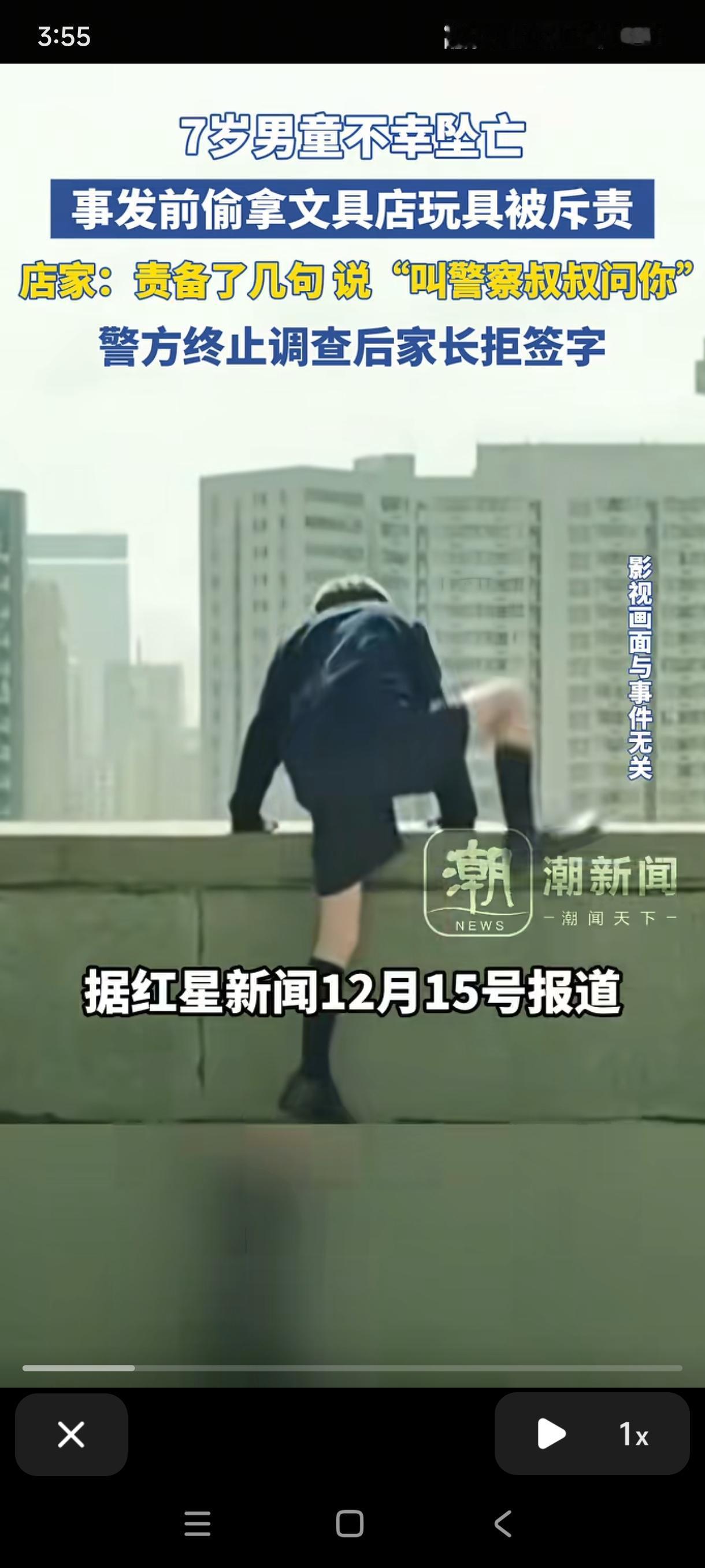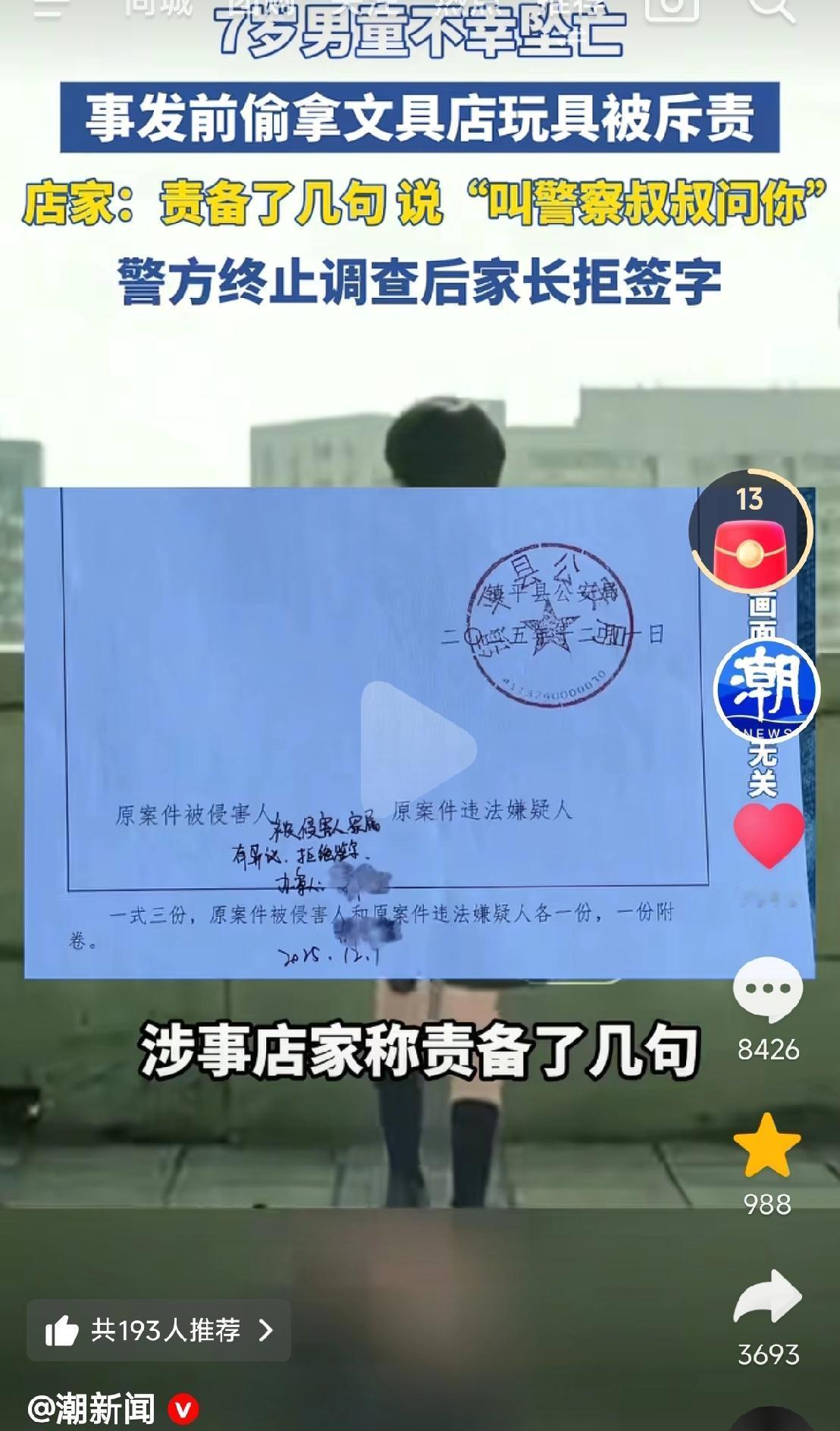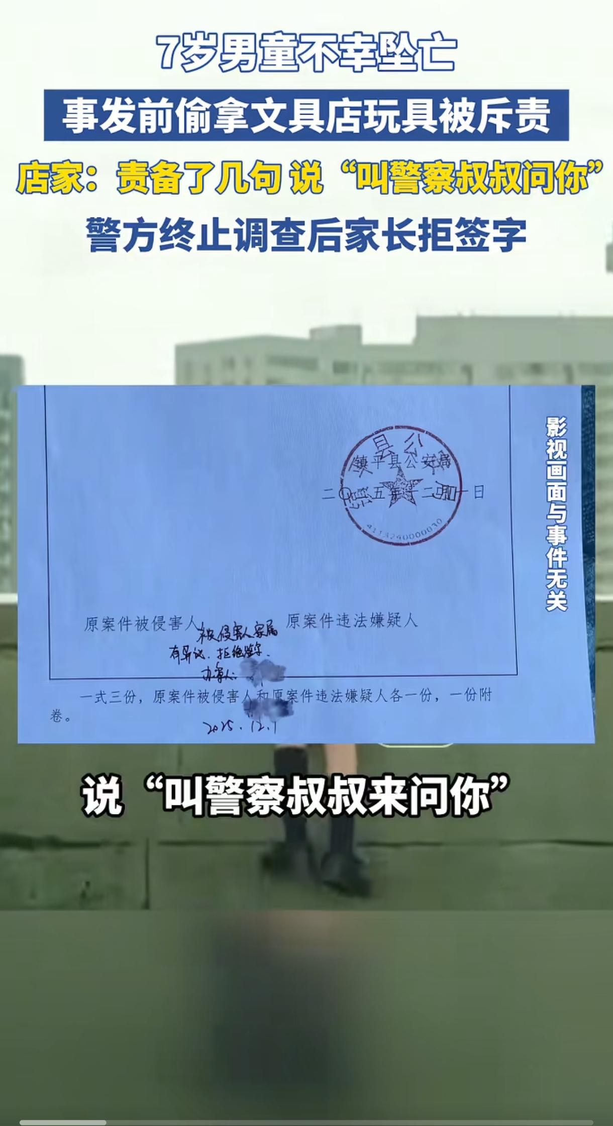河南一7岁男孩偷拿玩具,被店主搜出来,并斥责:“叫警察叔叔来问你!”没想到,男孩走出文具店后,就径直走上楼顶坠楼身亡了。 (来源:潮新闻) 11月21日,河南郑平县,男孩下午放学后走进小区外的一家文具店,看中一个售价几块钱的奥特曼玩具,便悄悄藏进衣服里,打算趁人不备偷偷带走。 不料这一幕还是被门外吃饭的店主逮个正着,他过来训斥了男孩几句,从他身上搜出了玩具,说:“等下叫警察叔叔来问你!” 估计店主这话本意是吓唬一下孩子,毕竟事后他也没有报警。没想到,孩子走出文具店之后,就径直走向楼顶一跃而下。 从离家到坠楼的这一段时间,仅仅23分钟,悲剧就发生了,让人猝不及防。 这个案例太令人痛心,毕竟死者还只是一个七岁的孩子,老板觉得自己很冤,小孩偷拿东西自己也只是斥责了他几句,孩子当时没有哭闹。 确实,面对那种情况,作为正常人来讲,对孩子训斥几句也是正常反应,相信一般人也都会这么做,因为有的孩子确实皮。 但孩子父亲还是把这一悲剧的导火索归咎于老板,说“孩子平时懂事开朗”,老板完全可以联系父母解决,为何要对孩子说那么重的话。 之后,警方介入调查,发现店老板并没有违法事实,于12月1日出具终止调查书让孩子家长签字确认,但孩子家长拒绝签字并准备起诉。 此事引发社会广泛关注,而大部分焦点都集中在男孩家长对男孩的管教问题上。如家长说孩子懂事,但为何会去偷东西;说孩子开朗,孩子又为何去跳楼,等等。 店老板究竟有没有责任,成为此案最大的争议点。 记得我们小时候偷邻居家的水果,被邻居狂追并斥责,但大人只认为小孩调皮不会去计较,孩子们也认为自己做了错事被骂很正常,更不会去寻死。 但现在的孩子明显心理那么强大了,感觉他们自尊心极强,受挫能力也很弱,也经受不了挫折与训斥。 从店主的角度看,他对孩子简单训斥几句,是为维护店铺的权益而做出的言行,这无可厚非,也被警方认定为无违法事实。 但从道义的角度看,估计店主也是难辞其咎。因为他忽略了七岁孩子的心智,很多网友也忽略了这一点,我刚开始看这个案子也是一样,认为家长有些无理取闹,但其实家长所说的也不无道理。 要知道,警察在孩子心里可说是权威与惩罚的代名词,一句叫警察叔叔来问你,足以击溃孩子的心理防线。其实店家可以换一种方式来处理,比如可以温和地跟孩子说让他的家长来付款,这样既维护了自己店铺的权益,也护住了孩子的自尊。 因此店家虽然并无违法行为,但在道义上估计说不过去,后续也可能会有一些赔偿但不会太大,当然这也只是推测而已。 这个悲剧也给家长警醒:平时要多多教育不要偷拿别人的东西,同时也要让孩子明白犯错并不可怕,家人永远是后盾。 还有我们对未年人传递规则时,也要多一份温柔与耐心,多一份共情与考量,为未成年孩子们多筑起一道生命的防线。