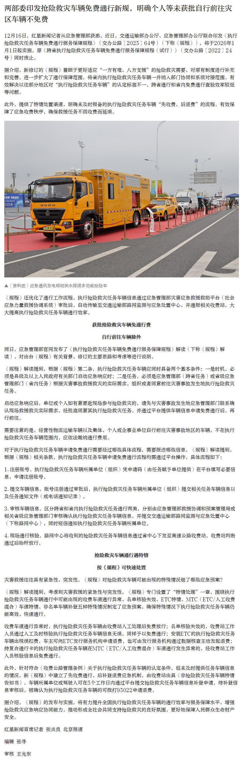 【#个人等未获批自行前往灾区车辆不免费#】#抢险救灾车辆免费通行新规发布# 12月16日,红星新闻记者从应急管理部获悉,近日,交通运输部办公厅、应急管理部办公厅联合印发《执行抢险救灾任务车辆免费通行服务保障规程》(交办公路〔2025〕64号)(下称《规程》),将于2026年1月1日起实施,原《跨省执行抢险救灾任务车辆免费通行服务保障规程(试行)》(交办公路〔2022〕24号)同时废止。据介绍,新修订的《规程》着眼于更好适应“一方有难、八方支援”的抢险救灾需要,对原有制度进行补充和完善。进一步扩大了通行保障范围,将省内执行抢险救灾任务车辆一并纳入部门协同和系统对接范围,有效解决以往部分地区对“执行抢险救灾任务车辆”的认定标准不一、跨省通行和省内免费通行查验效率较低等问题。此外,提供了特情处置渠道,明确未及时报备的执行抢险救灾任务车辆“先收费,后退费”的流程,有效保障了应急收费秩序,确保救援任务不因收费而延误。《规程》还优化了通行工作流程,执行抢险救灾任务车辆信息通过应急管理部灾害应急救援救助平台(社会应急力量救援协调系统)审批后,自动传输至交通运输部路网监测与应急处置中心,并通报相关收费站,大大提高执行抢险救灾任务车辆通行效率。网页链接