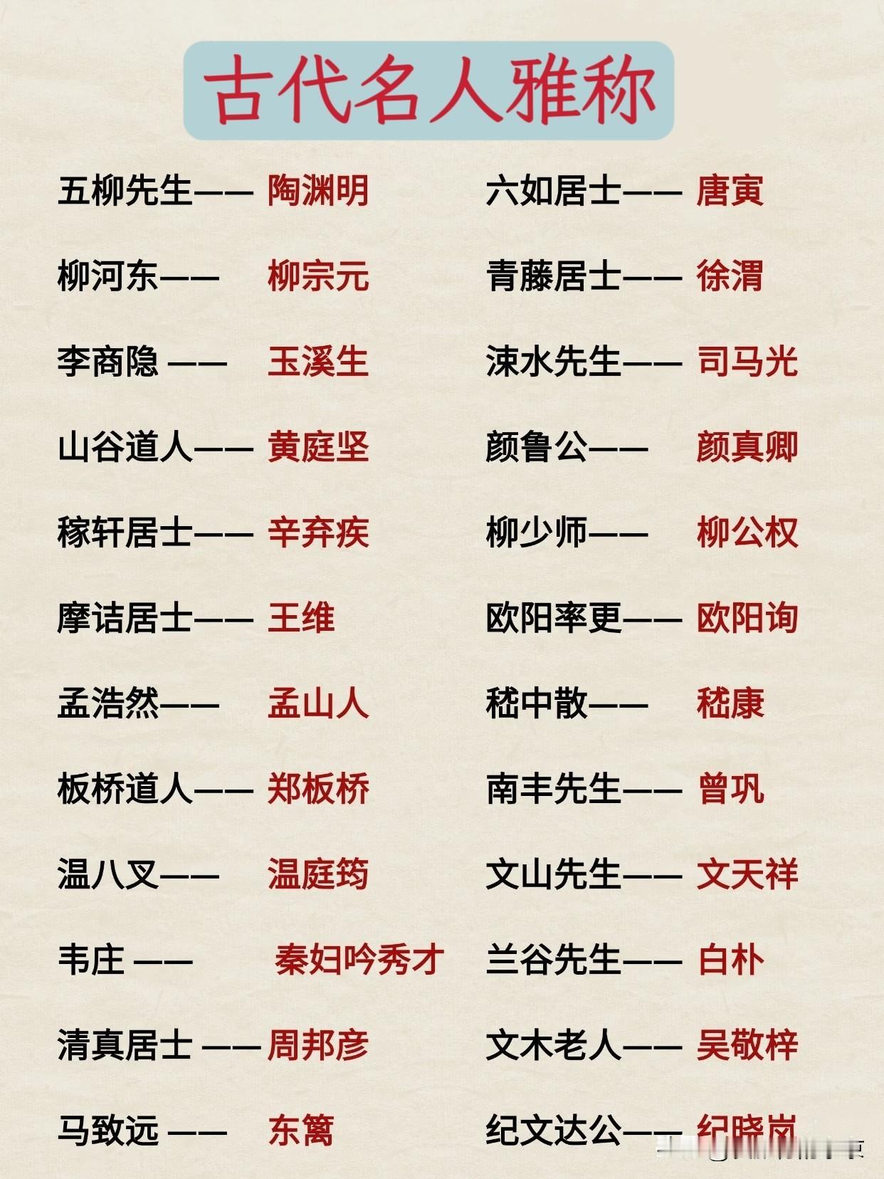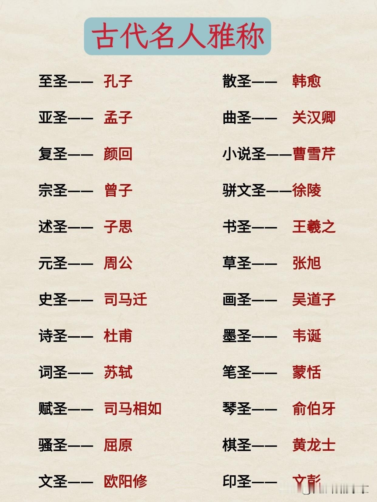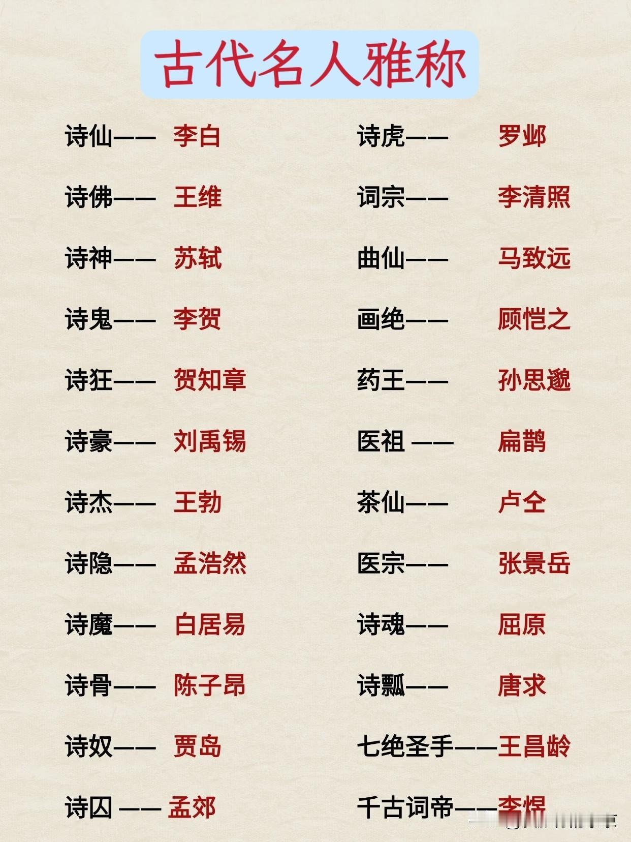 古代名人的雅称 古代名人雅称也太有韵味了吧 诗仙李白、诗圣杜甫、词宗李清照… 每个雅称都记载着他们的浪漫故事,既好记又有文化感! 例如: “三苏”是指苏轼、苏洵、苏辙, “三曹”则是曹操、曹植、曹丕。 “大李杜”指的是李白和杜甫, “小李杜”则是李商隐和杜牧。 ... 古人的浪漫果然是刻在骨子里的,一个雅称就是一段传奇! 赶紧给孩子收藏起来,各种备考可能会需要! 你还知道哪些冷门雅称? 雅称 诗仙 古代文学