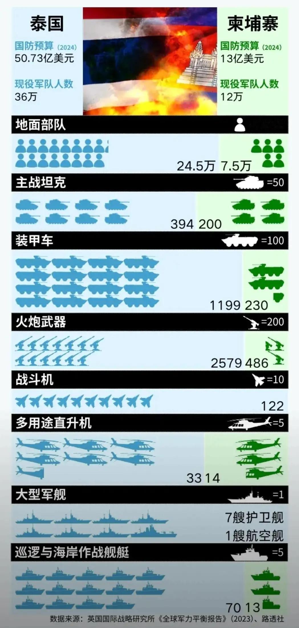 泰国和柬埔寨国防实力差距明显。从2024-2025年数据看,泰国全方位占优。