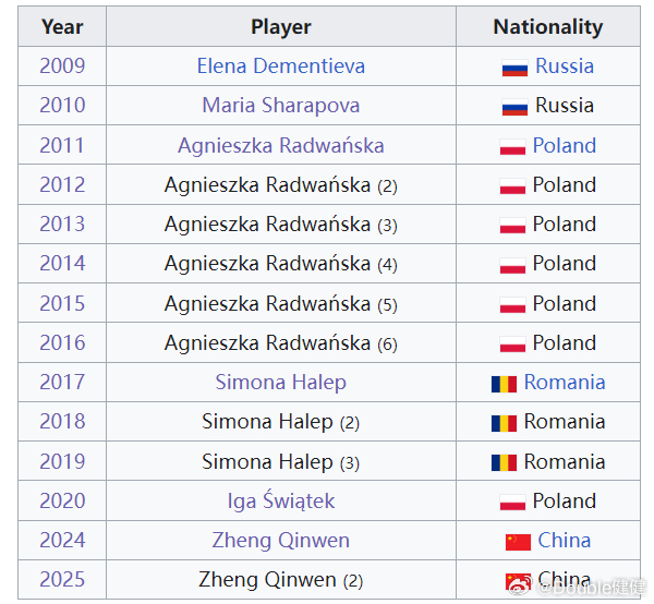 历届最受球迷欢迎单打奖:2009-2020期间,拉德万斯卡连续7年当选(2011-2016),哈勒普连续三年(2017-2019),斯瓦泰克、莎拉波娃和德门蒂耶娃各一次。2013年,拉德万斯卡击败了李娜、小威、莎拉波娃和阿扎伦卡获得此奖。2024和2025都是郑钦文!热点现场