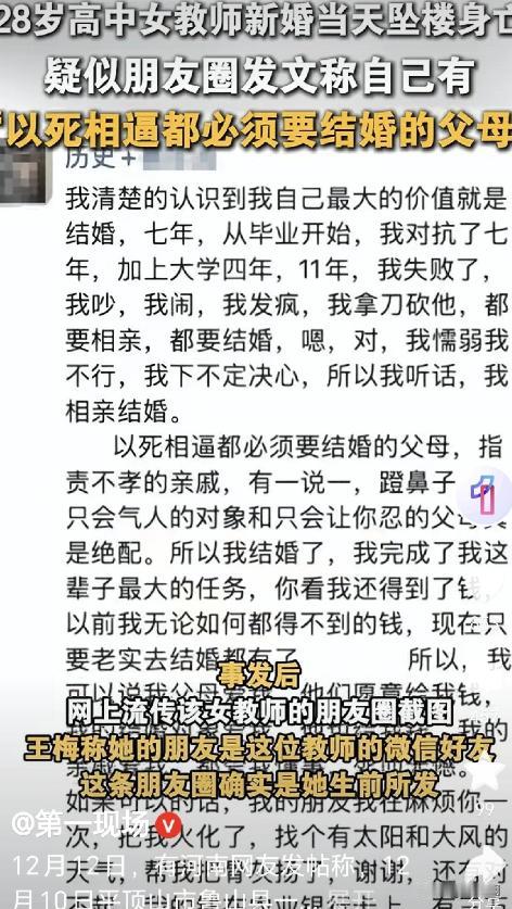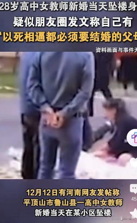 催婚的代价?河南平顶山,一28岁女高中教师发朋友圈: 父母以死相胁,要她相亲结婚,她哭她闹,亲戚说她不孝,她妥协了,找了个对象,对象蹬鼻子上脸,只会气她,父母不但不管,还要她忍耐,女子无奈之下,举办了婚礼,婚礼当天,女子登上7楼,她一跃而下,当场去世,女子留言: 我完成任务了…… 据网传信息显示,事发时间为上午,地点位于平顶山市某居民小区。当天原本是魏亚蕊举行婚礼的日子,但她却在婚礼前从所住小区高楼坠下,经抢救无效当场身亡。 当地警方随后介入处理,相关善后工作正在进行中。关于事件的具体经过及原因,目前尚未有权威部门发布完整通报。 事件引发关注的重要原因,源于一张在网络上广泛流传的朋友圈截图。 截图内容显示,魏亚蕊在事发前曾发布长文,讲述自己被父母以“以死相逼”的方式要求相亲结婚的经历。 她在文中提到,自己曾哭过、闹过,也试图反抗,但换来的却是亲戚指责其“不孝”“自私”。 在家庭和舆论的双重压力下,她最终选择妥协,开始与一名并非出于自愿的对象交往。 然而,她在文字中称,对方不仅缺乏尊重,还经常对她进行言语刺激与情绪压迫。当她向父母求助时,得到的回应却是“忍一忍就好了”“结婚了就好了”。 该朋友圈最后一句“我完成任务了……”在事件曝光后,被大量网友视为其内心绝望的集中体现。相关截图真实性尚待进一步核实,但已在舆论场引发巨大震动。 多位网友自称为知情人或当地居民,在评论区表示,魏亚蕊性格温和,工作认真,是学生眼中的好老师。 同事眼中,她教学能力突出,平日少言寡语,很少谈及个人情感问题。正因如此,事件发生后,不少熟人表示“完全没有想到”。 有心理学从业者指出,从网络披露的信息来看,魏亚蕊可能长期处于“顺从—压抑—自我否定”的心理状态之中。 婚礼在外人看来是人生大事,但对当事人而言,却可能成为“最后一道无法逃离的枷锁”。当个人意志被持续忽视,情绪出口被彻底封堵,极端行为便有了发生的土壤。 事件曝光后,评论区迅速被情绪淹没。“再也不催孩子结婚了”成为置顶高频语句,背后是一条条带着真实经历的吐槽。 有网友说,自己30岁未婚,每次回家吃饭就像“开批斗会”,七大姑八大姨轮番上阵,手机里塞满相亲对象照片,“不看就是不懂事”。 她原本性格开朗,却在长期催婚中变得失眠、焦虑,甚至开始怀疑是不是“不结婚就是失败者”。 一名男性网友也留言称,妹妹因拒绝相亲被父母断了经济支持,“不是不爱她,是觉得她‘不听话’”。妹妹后来抑郁休学,他才意识到,所谓为你好,其实是把父母的焦虑转嫁给孩子。 还有女网友写道,她曾被父母逼着和“条件合适”的对象订婚,对方在相处中处处贬低她,“你学历高有什么用,结婚后还不是要听我的”。 她向母亲哭诉,却只得到一句:“男人都这样,忍忍就过去了。”那一刻,她第一次明白,自己在父母眼中只是“待交付的人生任务”。 评论区里,类似故事层出不穷:有人被威胁断绝关系,有人被拿亲戚比较羞辱,有人被贴上“不孝”“自私”的标签。 网友们愤怒又无力,反复追问:为什么不结婚会被视为罪过?为什么孩子的痛苦,总要为父母的面子让路? “以爱之名的逼迫,本质仍是伤害。”有网友评论道,“如果父母把孩子当成‘任务完成器’,而不是独立的人,悲剧就可能随时发生。” 也有法律与社会学人士指出,在一些家庭中,婚姻被视为对子女价值的终极评判标准,忽视了个体幸福感与心理健康。 尤其在部分中小城市,“大龄未婚”仍被贴上负面标签,家庭、亲戚与邻里共同构成无形压力网。