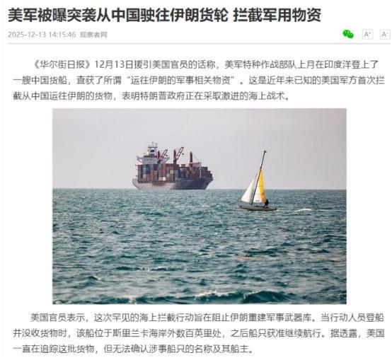 美国突袭检查中国开往伊朗的商船,老特简直是送上门的神助攻!它这一查,直接给中国反制立了标杆——以后美国开往台湾的可疑船只,是不是我们完全可以依法登船检查! 据美媒报道,12月13日,美国那边没打声招呼,也没拿出什么实实在在的证据,就把一艘咱们中国开往伊朗的商船给拦下检查了。 这艘船当时正行驶在印度洋斯里兰卡海岸线附近,美军特种部队直接登船,把船上装载的一批高氯酸钠给扣了下来,之后还宣称这些物资可能被伊朗用来提炼导弹固体燃料,二话不说就给收缴销毁了才放行。 可实际上这种东西根本不在联合国对伊朗的禁运清单里,就连美国自己搞的单边制裁条款里,也没说不让第三国给伊朗出口这玩意儿。 说白了,美国这次就是纯粹凭着自己的怀疑就动手,既没有提前跟咱们沟通,也没公示任何能站得住脚的证据链,完全是把自己的霸权逻辑当成了行事准则。 有国际法专家就提过,就算联合国给过部分成员国拦截涉伊朗违禁品的授权,也得遵循透明的证据披露流程,像美国这样含糊其辞的操作,本质上就是地缘政治层面的随意拿捏。 有意思的是,这事儿让人忍不住想起三十多年前的银河号事件,同样是在印度洋海域,同样是美国以“怀疑”为借口强行登船检查,最后要么没查出所谓违禁品,要么就是扣着不属于禁运范畴的物资不放。 只不过这次美国学聪明了点,没把船长时间扣押,只扣了货物就放行,想以此减少外交层面的麻烦,可这种避重就轻的做法,反而更坐实了其长臂管辖的本质。 更关键的是美国可能自己都没琢磨明白,这步棋等于是给咱们递了把合规的“尚方宝剑”。按照《联合国海洋法公约》的规定,各国军舰只有在怀疑对方船舶从事海盗、贩毒、奴隶贩卖等明确违法活动时,才能行使登临权。 美国这次在没有明确证据的情况下,就对第三国开往伊朗的商船动手,等于亲手打破了自己一直标榜的所谓“规则”,也给咱们后续的反制行动树立了现成的参照标杆。 接着就有人想到既然美国能拿“怀疑”当理由在公海拦船,那咱们在自己管辖的台湾海峡区域,遇到美国开往台湾的可疑船只,自然更有理由依法查验。 国台办早就明确表态过,台湾海峡水域分别属于中国内水、领海、毗连区和专属经济区,根本不存在所谓“国际水域”的说法,这一点既符合国际法规定,也有咱们国内法的坚实支撑。 这就意味着,任何国家的船舶在台湾海峡航行,都必须遵守中国的相关法律法规,一旦出现涉嫌输送违禁物资、危害中国主权安全的情况,咱们完全有权利采取相应的执法措施。 而且咱们可不是没有执法经验的,之前面对美国针对我国航运、造船行业的不合理限制,商务部早就明确表示反对,不仅宣布对涉及美国元素的船舶收取特别港务费,还把部分协助美方实施不公调查的企业列入反制清单,这些举措都是基于《国家安全法》《反外国制裁法》等法律法规作出的合理回应。 现在有了美国这次拦截商船的先例,咱们后续针对美国开往台湾的可疑船只采取行动,就更有法理上的说服力,也让国际社会看清谁才是真正遵守规则,谁在肆意践踏规则。 退一步说,美国自己也常打着“联合执法”的幌子,在其他国家专属经济区内对他国船舶动手,之前就有美海警在基里巴斯附近登上中国渔船检查,最后啥问题都没发现的情况。 专家当时就指出,这种行为本质上就是对他国主权的侵蚀,是典型的双重标准。如今美国把这种双重标准用在咱们身上,咱们自然可以用同样的逻辑,在维护自身主权的框架内采取对等行动。 美国这次的操作,说白了就是搬起石头砸自己的脚。原本想通过打压中国与伊朗的正常贸易往来施压,没想到反而给咱们的反制行动提供了绝佳的契机,让咱们在维护国家主权和领土完整的问题上,多了一项有理有据的执法选项。 未来要是再有美国船只打着“航行自由”的幌子,往台湾输送可疑物资,咱们完全可以参照美国这次的做法,拿出充分的法律依据登船检查,让其为自己的双重标准付出应有的代价。 毕竟在主权问题上,任何国家都没有特权,美国既然敢开这个头,就必须承担由此带来的一切后果。