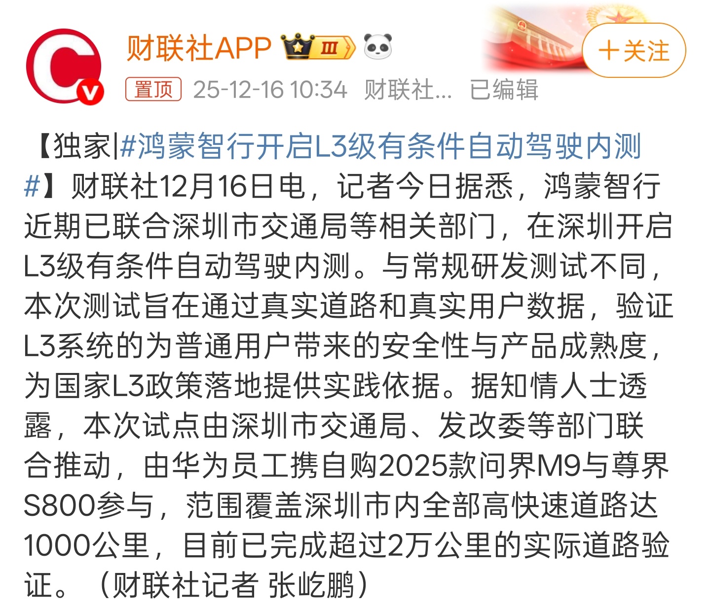鸿蒙智行开启L3级有条件自动驾驶内测我国首批L3自动驾驶车型获准入许可 昨天长安和极狐的两款L3测试车型是国家层面的,鸿蒙智行这个是深圳主导的。从技术蹭层面来说,华为肯定不会缺席L3测试,估计后面工信部会批准更多的车型,耳熟能详的大型车企估计都会有车型获批。老张聊车