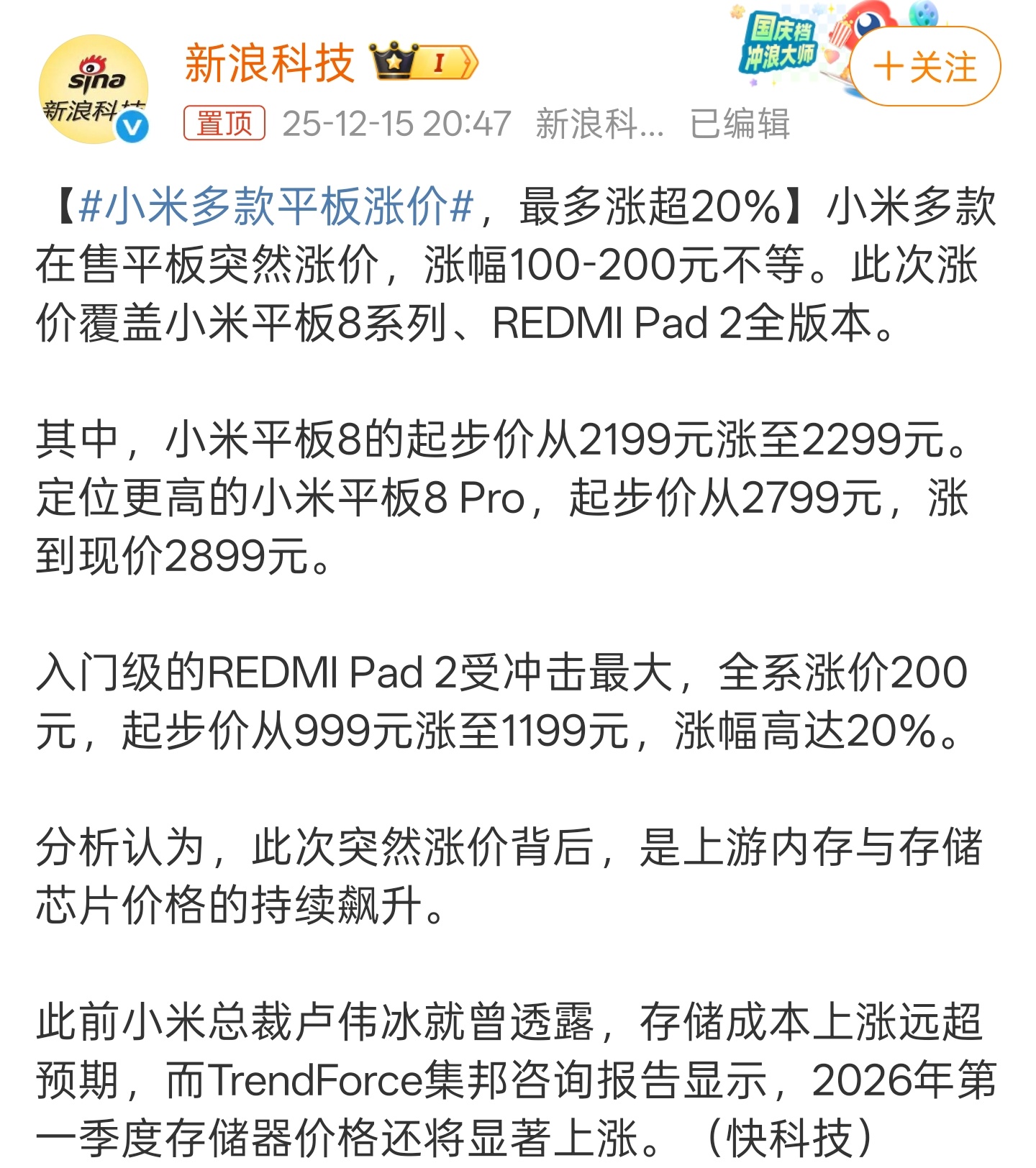 小米多款平板涨价成本上涨太快,扛不住了,但凡能扛就不会涨价。小米的产品,一旦涨价对于销量的压制还是很明显的。明年的手机大概率要涨点价格了,对产品力的要求更高了。老张聊数码