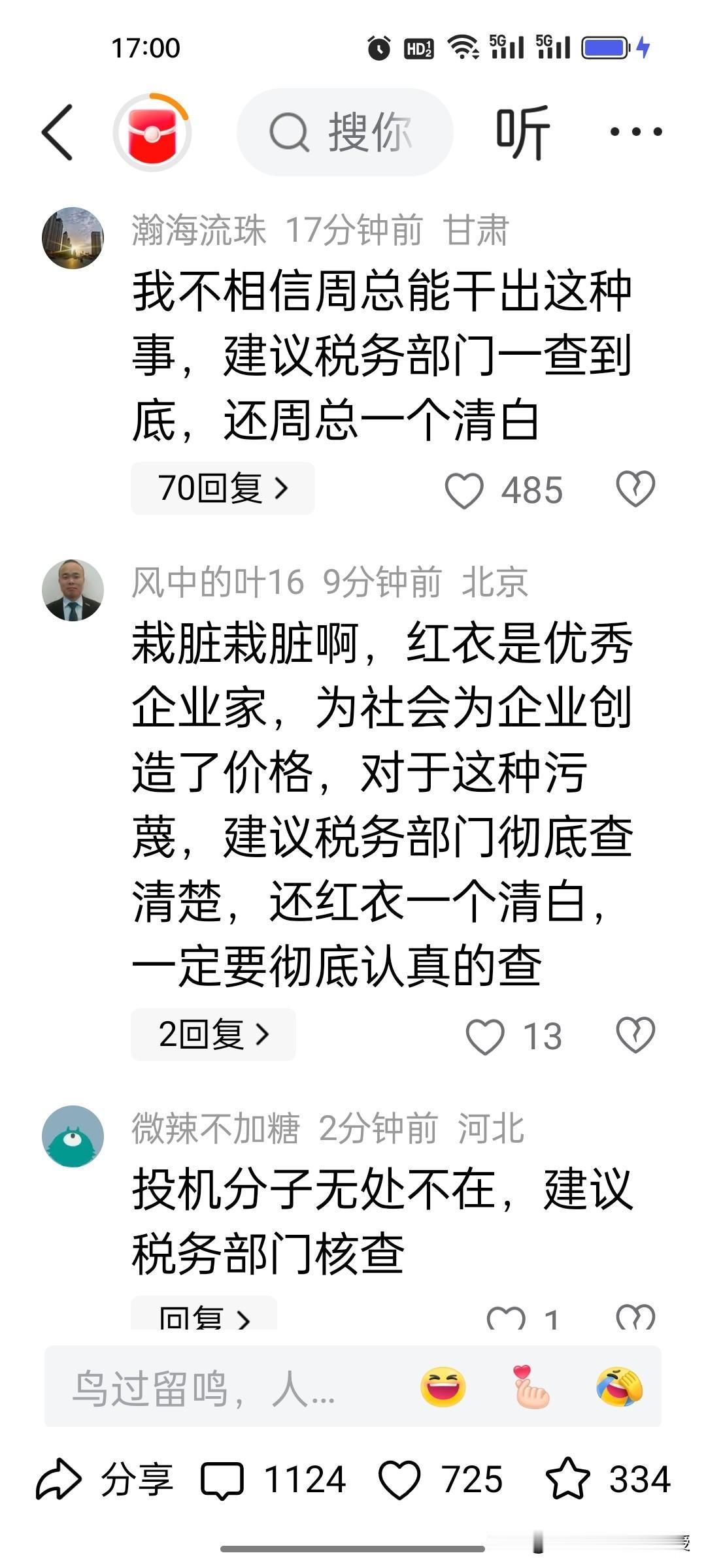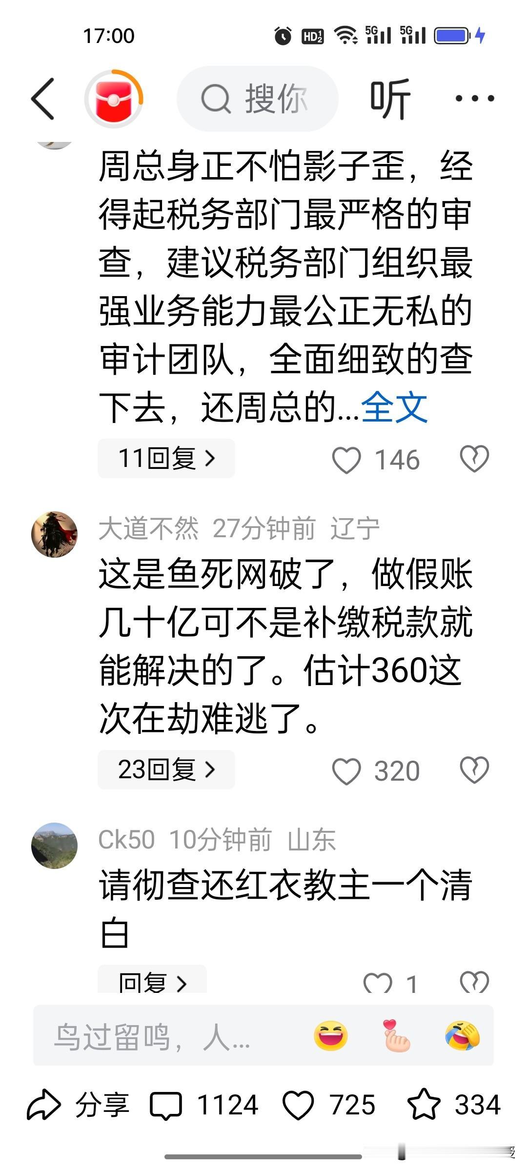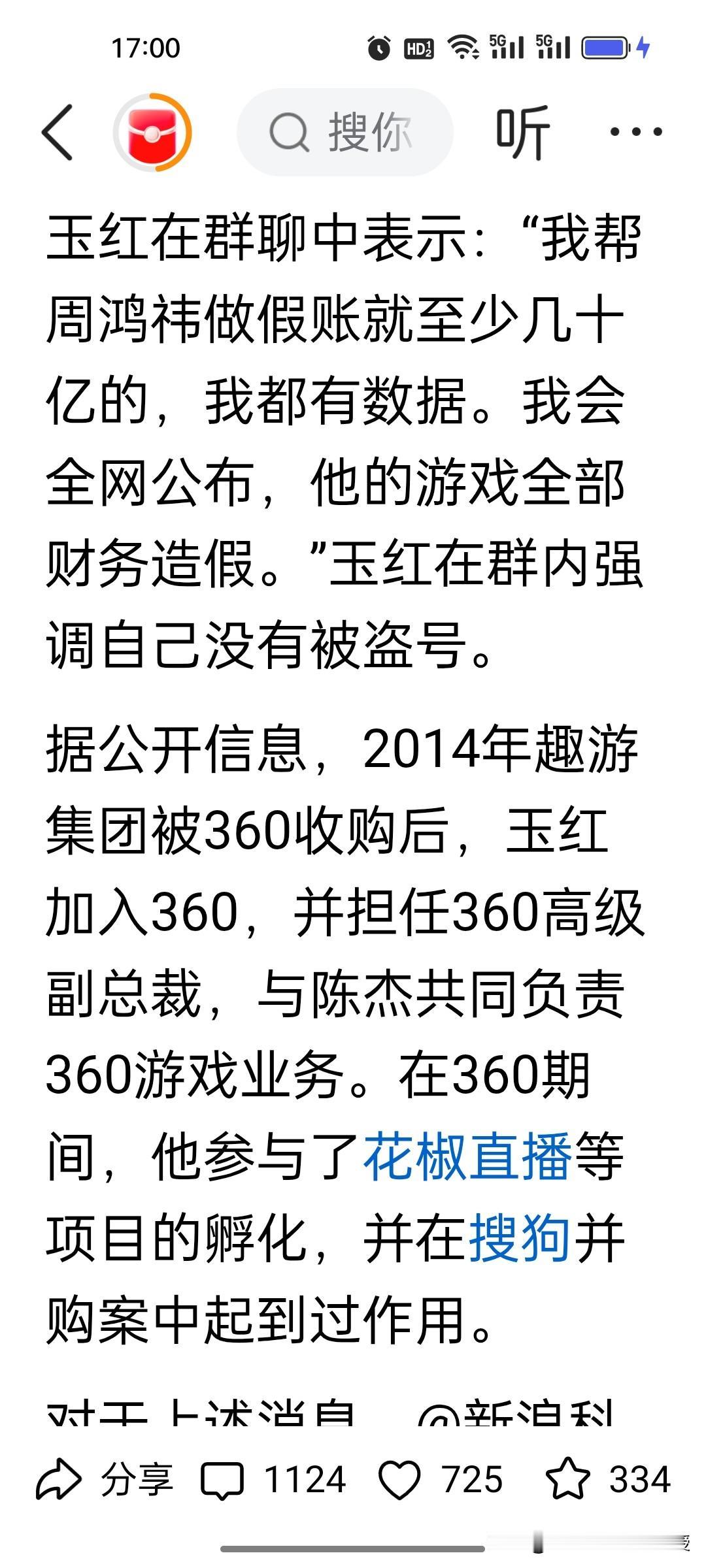 刚刚看到,周鸿祎惹上大麻烦!前360公司副总裁玉红,在朋友圈以及社交平台发文称,帮周鸿祎做假账至少几十个亿,玉红还要公布数据,还说周鸿祎的游戏全部财务造假。这可不是随便发发文的玩笑话,玉红揭发周鸿祎,自己也逃不开干系。全网都在请求税务稽查部门对周鸿祎360公司全面查税,要还周鸿祎一个清白。 另外,周鸿祎在美国的上市公司叫奇富科技,若真的涉嫌财务造假,会不会牵扯到上市公司,这可不是补缴税款那么简单的了,弄不好还要惹上更大的官司,周鸿祎还是全国政协委员,不知道什么事情会惹得双方如此剑拔弩张,周鸿祎现在要面对的第一关就是税务部门的全面审查。