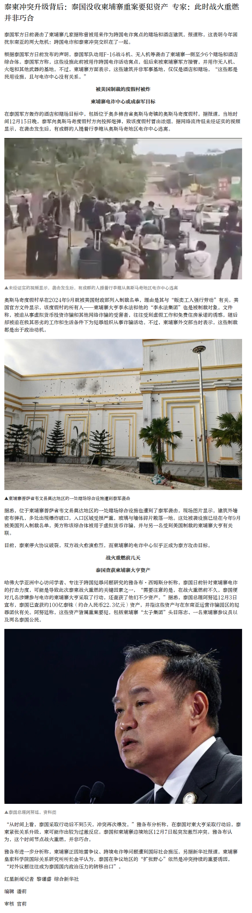 【#泰柬冲突升级背后#】#柬埔寨电诈中心或成泰军目标# 泰国军方日前袭击了柬埔寨几家据称曾被用来作为跨国电诈窝点的赌场和酒店建筑。报道称,这表明今年困扰东南亚的两大危机:跨国电诈和泰柬冲突交织在了一起。根据泰国军方日前发布的声明,泰国军队动用F-16战斗机、无人机等袭击了柬埔寨一侧至少6个赌场和酒店综合体。泰国军方称,这些设施此前被用作跨国电诈活动窝点,但后来被柬埔寨军方接管,并用作无人机、火炮和其他武器的基地。不过,柬埔寨方面表示,这些建筑并非军事基地,仅仅是酒店和赌场,“这些都是民用设施,且与电诈中心没有关系。在泰国军方轰炸的酒店和赌场目标中,包括位于奥多棉吉省奥斯马奇镇的奥斯马奇度假村。据报道,当地时间12月15日晚,泰军向奥斯马奇度假村方向投掷炮弹,致该度假村冒出浓烟。据网络流传但未经证实的视频显示,在袭击发生后,有成群的人提着行李箱从奥斯马奇地区电诈中心逃离。#泰国没收柬埔寨重案要犯资产# 奥斯马奇度假村早在2024年9月就被美国财政部列入制裁名单,理由是其与“贩卖工人强行劳动”有关。美国官方文件显示,该度假村的所有人——柬埔寨大亨李永法和他的“李永法集团”也是被制裁对象。文件称,被迫从事虚拟货币投资诈骗和其他网络诈骗的受害者,往往受到虚假工作和免费住房承诺的诱惑,随后却被迫在极其恶劣的工作和生活条件下为犯罪组织从事诈骗活动。不过,柬埔寨外交部当时表示,这些制裁都是出于政治动机。据悉,位于柬埔寨菩萨省韦文县莫达地区的一处赌场综合设施也遭到了泰军袭击。现场图片显示,建筑外墙密布弹孔,多处出现爆炸破口,入口区域受损严重,玻璃与墙体碎片散落一地。这处被袭设施已经在今年9月被美国列入制裁名单,美方称该综合体被用于虚拟货币诈骗,并与另一名受到美国制裁的柬埔寨大亨有关联。目前,泰柬停火协议破裂,双方战火愈演愈烈,而柬埔寨的电诈中心似乎正成为泰方攻击目标。网页链接