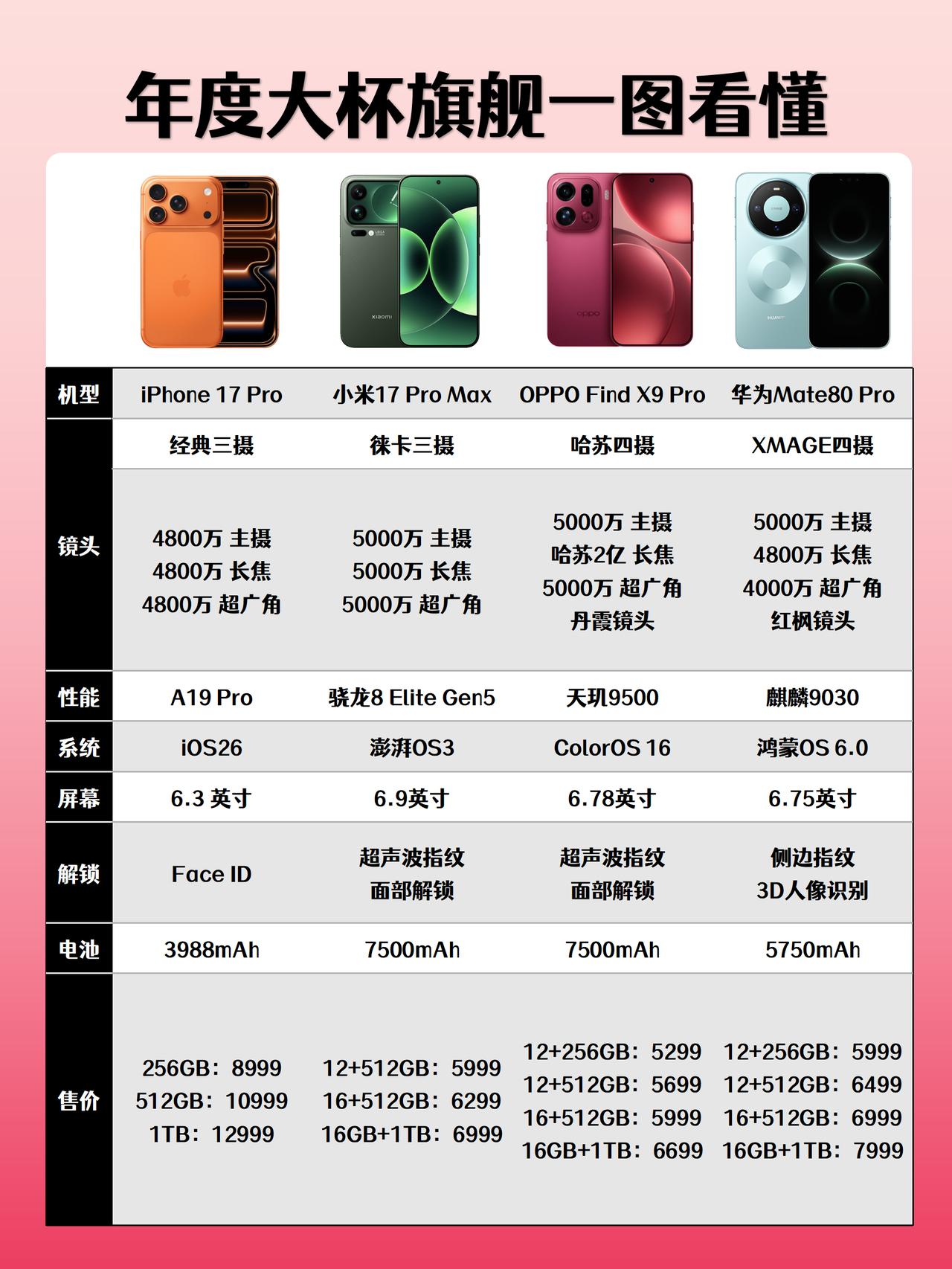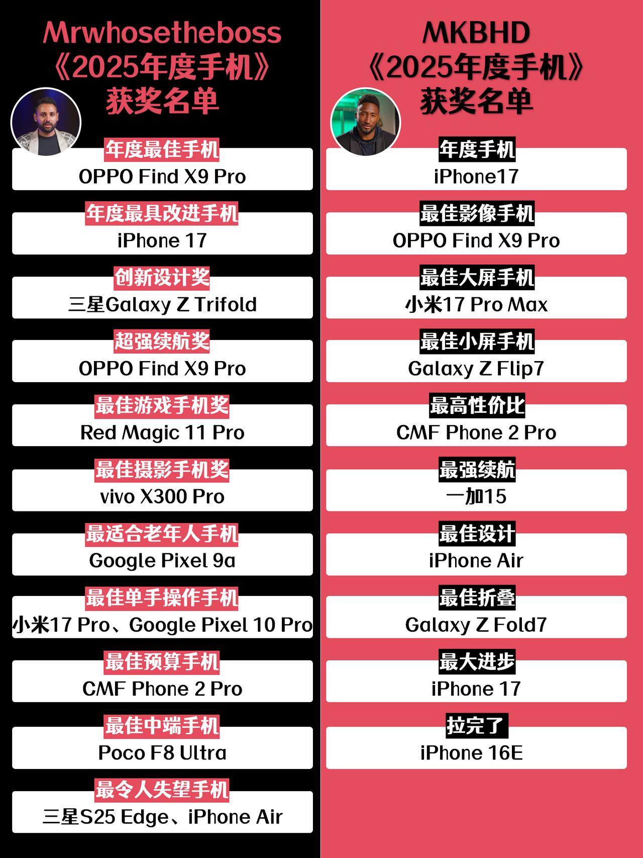 2个榜单总结机圈乱斗?我的4大另有“机”选 最近外网两位数码顶流把《2025 年度手机》一公布,🥇榜单直接刷屏。 Mrwhosetheboss、MKBHD 各有各的评法,iPhone、OPPO、小米这些熟面孔轮番上榜, 有的拿年度机型,有的拿影像、续航、性价比之类的奖。 说白了,这个级别已经不是“谁行谁不行”,而是各自擅长的点不一样。 参考了不少海内外的评测,个人觉得如果年底打算换个好用的旗舰手机,这四台基本可闭眼冲👇🏻 ✅iPhone17 Pro: 经典苹果三摄,都是4800万像素,系统和视频依旧是强项,稳定、省心,生态优势明显,但3988mAh 电池确实有点绷不住,重度用得带充电宝 💰256GB 8999 起,适合预算充裕且不想折腾的果粉 ✅小米17 Pro Max: 6.9 英寸大屏刷剧巨爽,7500mAh 电池续航给力,徕卡三摄,主摄、长焦、广角都是 5000万像素。 💰12+512GB 5999 起,适合米粉+尝鲜个性十足的创意背屏 ✅OPPO Find X9 Pro: ColorOS16安卓流畅代表,还有AI功能大升级,AI脑图、AI声音克隆、AI人像补光灯都非常实用。7500mAh 电池 + 天玑 9500,性能续航都没短板。哈苏四摄(5000 万主摄 + 哈苏2 亿长焦 + 5000万超广角 + 丹霞色彩还原镜头)。 💰12+256GB 5299 起,如果看重影像和超长续航,那OPPO Find X9 Pro值得重点考虑 ✅华为Mate80 Pro: 鸿蒙6.0交互玩法丰富,通信能力拔尖,侧边指纹+3D 人像识别解锁,后置XMAGE四摄(5000 万主摄 + 4800 万长焦 + 4000万超广角 + 第二代红枫原彩镜头),人像肤色巨自然 💰12+256GB 5999 起,很适合商务人士 今年的大杯旗舰,每一台都有自己的硬核优势,真的没有“买错”,只有“更适合谁”。你换机的话,更看重哪一点? 年度旗舰 MKBHD OPPOFindX9Pro iPhone17Pro 数码评测 手机对比 换机推荐 小米17ProMax