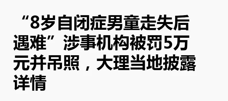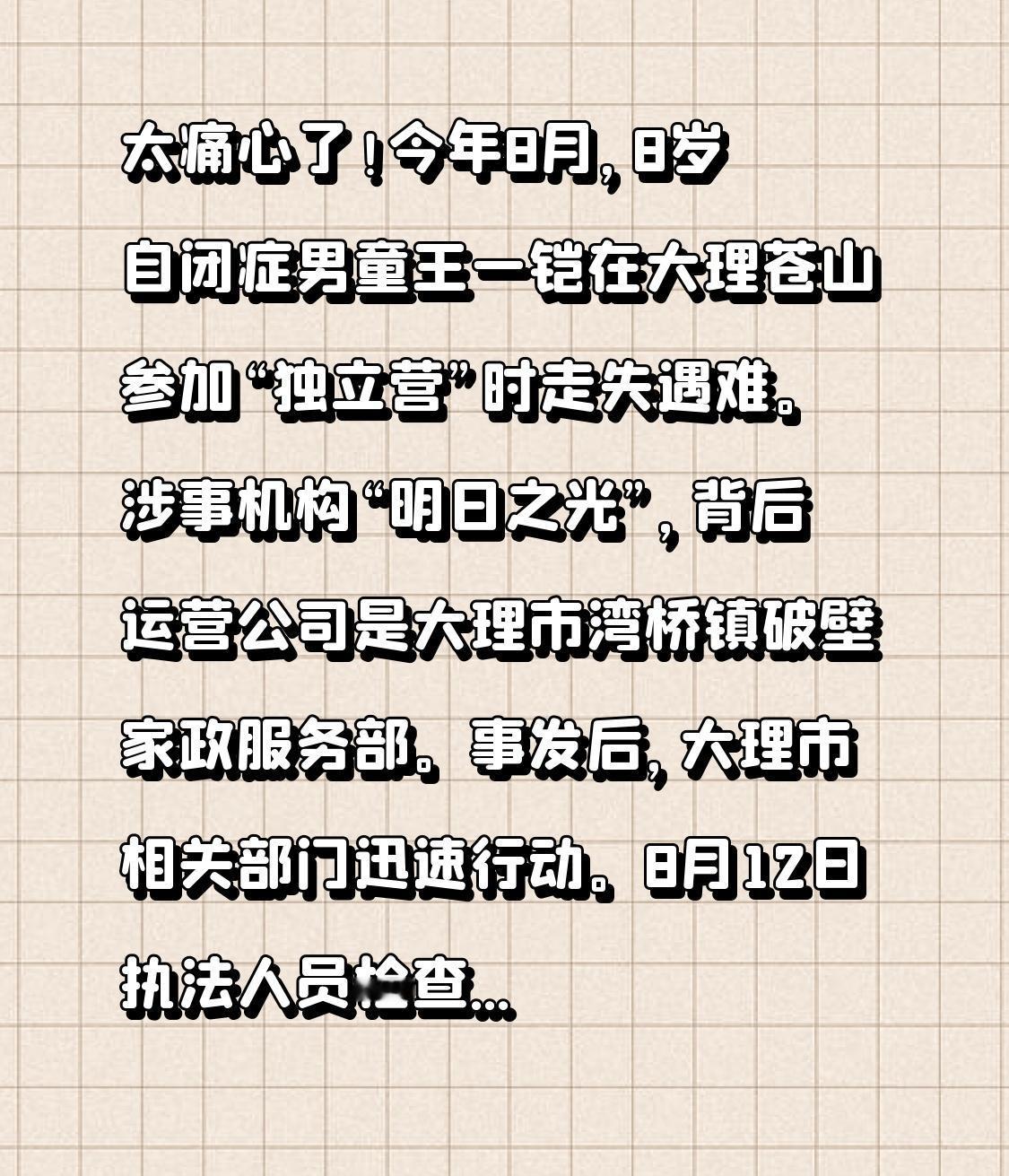 大理“8岁自闭症男童走失后遇难”涉事机构被罚5万元并吊照,当地披露详情→ 2025 年 12 月 15 日,大理市市场监督管理局对 “8 岁自闭症男童走失后遇难” 事件的涉事机构作出了罚款 5 万元并吊销营业执照的行政处罚决定。当地披露的该事件及涉事机构违法违规的核心详情如下: 1️⃣事件核心经过 2025 年 8 月 9 日,8 岁自闭症男童王一铠跟随涉事机构 “明日之光” 组织的团队攀登苍山时走失。事发后当地多部门累计投入大量专业救援力量和志愿者展开搜救,历经 4 天搜寻,于 8 月 13 日 17 时许,在大理镇清碧溪北侧山涧发现王一铠,彼时男童已无生命体征,经现场勘验和综合调查,初步排除刑事案件可能。此前公安机关于 10 月对该案作出撤案决定,认为涉事机构带队路线成熟、其行为与孩子死亡无直接因果关系,且不构成非法经营。 2️⃣涉事机构的违规经营事实 超范围经营且无证提供餐饮: 涉事机构 “明日之光” 背后的运营主体是大理市湾桥镇破壁家政服务部,该个体工商户 2025 年 1 月注册时,核准的经营范围仅为家政服务,却实际面向 4 - 12 岁自闭症儿童开展特殊服务,每月收费达 13000 元。此外,机构聘请专职炊事员为儿童和工作人员提供三餐,但始终未办理《食品经营许可证》,属于未经许可从事餐饮服务的违法行为。不过因食材采购及费用由家委会家长自行负责,相关食品的货值金额及违法所得无法核算。 安全保障与合同签订严重缺位: 机构开展服务时,既未与儿童家长或法定监护人签订服务协议,也未就服务中的人身安全风险作出书面约定和告知说明。其课程包含徒步、爬山等户外活动,却未充分考量自闭症儿童特殊的行为模式与认知特点,未建立对应的风险预防机制和应急处置预案,这也是导致男童走失后不幸离世的关键因素之一,该事件还造成了恶劣的社会影响。 3️⃣涉事机构的现场勘验情况 8 月 12 日执法人员检查发现,涉事机构的经营场所是一栋四层砖混结构民房,内部设有会客厅、3 间看护室、办公室、美术室等设施,共有 28 名工作人员,当时共有 12 名自闭症儿童在该机构接受服务。其既定流程为家长每日 7 点 20 分前送孩子到机构,18 点 40 分(每周一除外)接回孩子。 4️⃣家属后续维权动态 王一铠的家属对公安撤案决定并不认可,其代理律师曾控告涉事机构和四名带教老师涉嫌 “过失致人死亡罪” 和 “非法经营罪”。家属认为,四名带队老师多为苍山本地人,理应知晓山地危险性,应当预见孩子失踪后的死亡风险。目前涉事机构已关门解散,四名带队老师处于失联状态,家属表示会继续通过法律途径追究涉事机构和带队老师的法律责任。