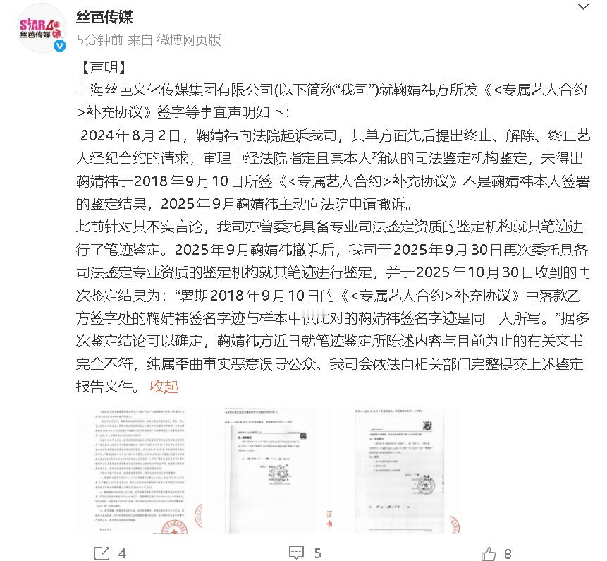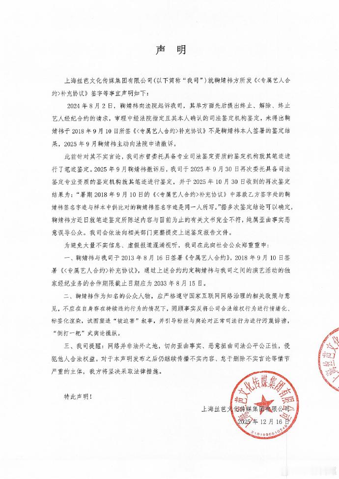 丝芭传媒否认伪造鞠婧祎签名字迹丝芭传媒再回应鞠婧祎 “据多次鉴定结论可以确定,鞠婧祎方近日就笔迹鉴定所陈述内容与目前为止的有关文书完全不符,纯属歪曲事实恶意误导公众。我司会依法向相关部门完整提交上述鉴定报告文件。”