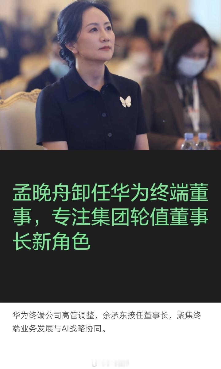 孟晚舟卸任华为终端公司董事这哪是卸任,明明是升维聚焦!孟晚舟当轮值董事长管集团全局,余总在终端一线冲锋,分工明确效率拉满,华为这布局太清晰了
