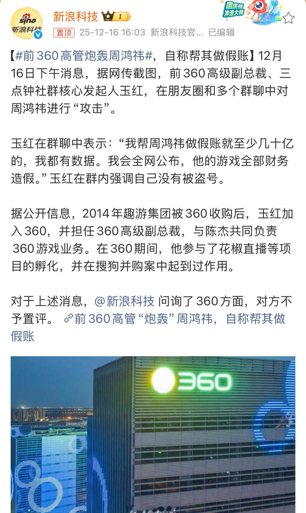 前360高管炮轰周鸿祎这个瓜不小。要是是真的,周鸿祎就倒霉了。如果是假的,那这个高管妥妥造谣污蔑了,建议周鸿祎严肃处理