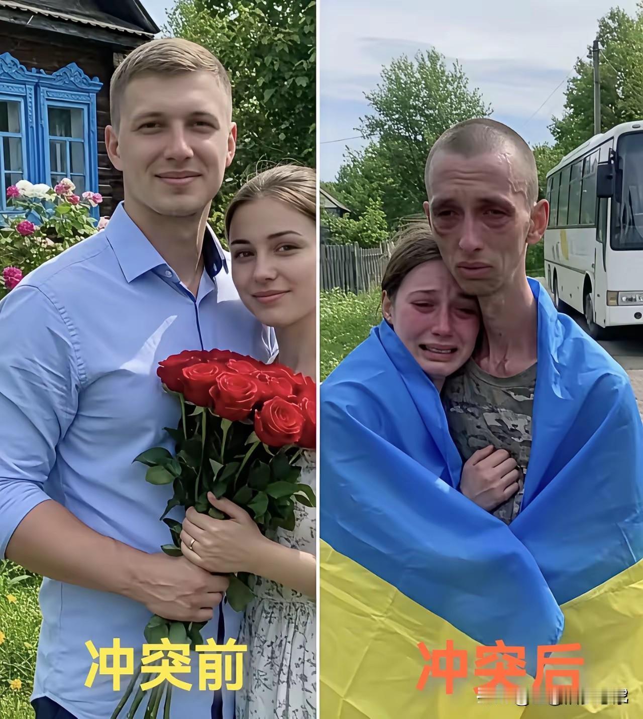 一张照片,两种人生。 左边是手捧玫瑰的温柔爱人,右边是被战火啃去神采的憔悴归人。战争撕开的何止是脸庞的青涩,更是普通人对生活的所有美好期待。和平二字,写起来只有十笔,却是战火里的人拼尽全力想抓住的光。 战争的代价