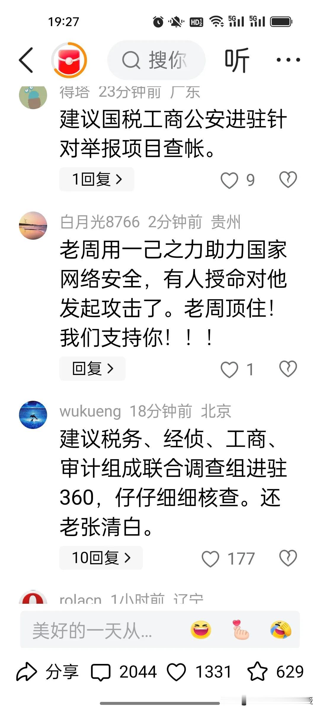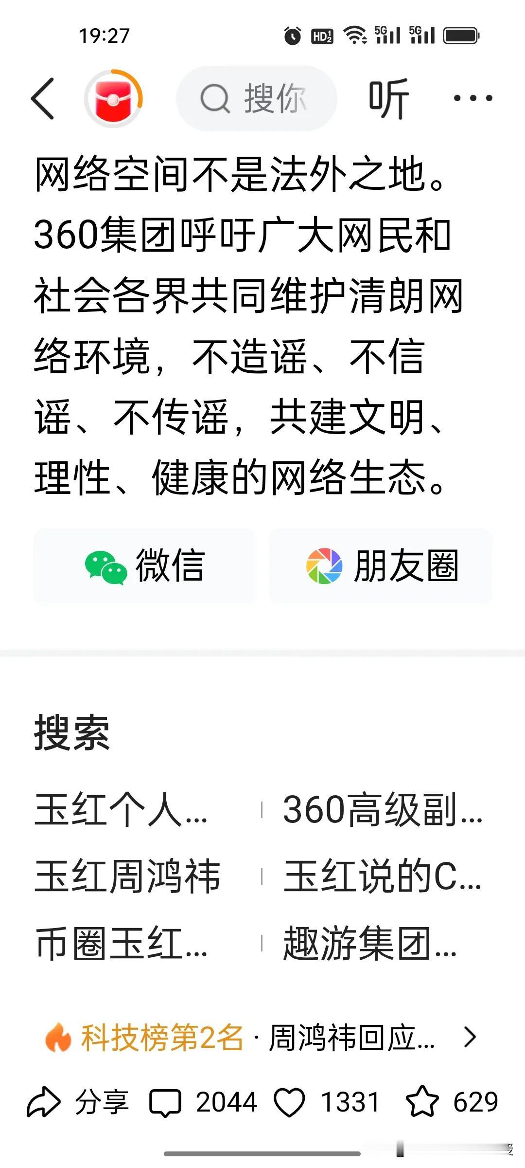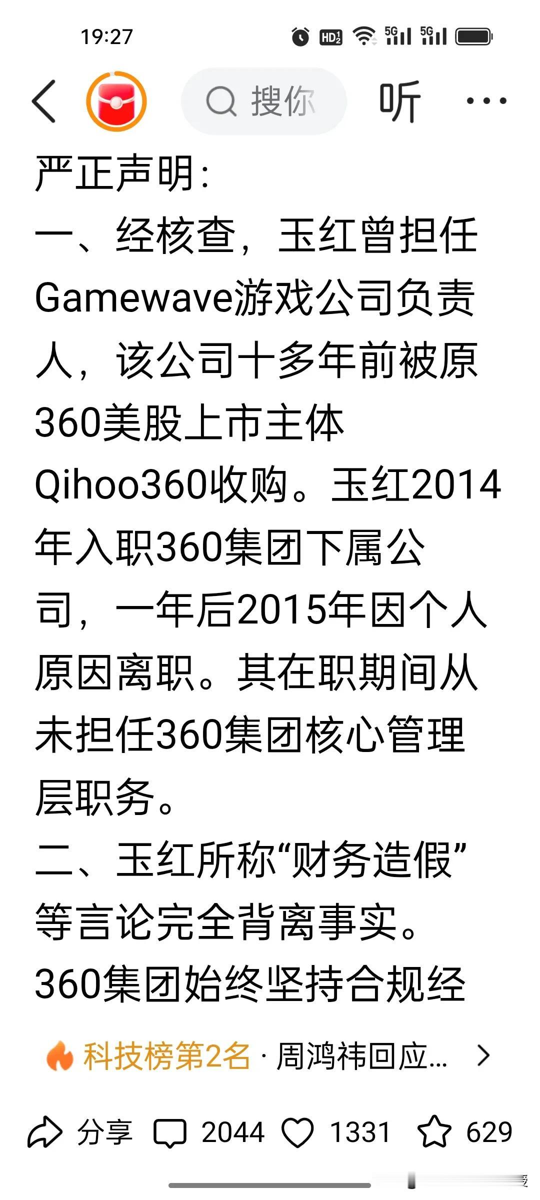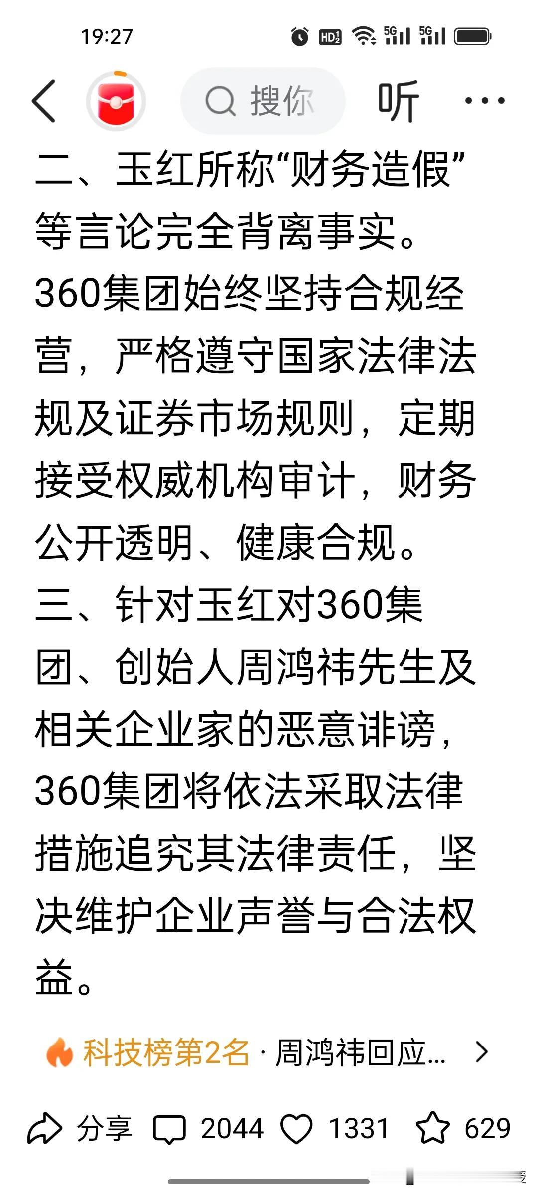 看了360公司的严正声明,揭发周鸿祎公司财务造假的玉红现在有两个选择。 第一,承认自己是一时气头乱说的,公开发表声明,然后跟周鸿祎私下解决矛盾,把负面影响降到最低,对360公司的股价影响也降到最低。 第二,就是拿出财务造假的确凿数据公之于众,或者直接抄送给国家税务局或者证监会,财务造假导致的到底是虚增收入还是偷漏税,相关部门都会去核查,这就“鱼死网破”了,确实是财务造假的话,那么360公司就要ST了,玉红自己也要承担财务造假的法律责任,看证监会怎么处罚了。 相信周鸿祎会以最快的速度解决这个“飞来横祸”,要不然明天33.93万户中小投资者要彻夜难眠了!