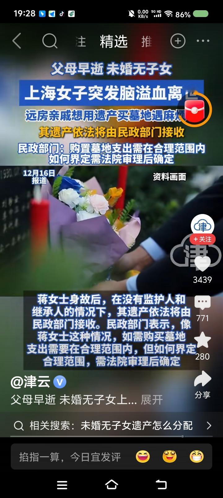 媒体,你的社会责任呢?—— 据报道,一女子去世,未婚未育,遗产由民政部门依法接收。亲属想用逝者遗产购墓地。民政部门表示,墓地支出须在合理范围内。 点评: 一、新闻视频配乐不当,易误导人。 二、这样的新闻应该普法:为什么被民政部门接收?很多人认为,亲戚可以继承。 还有人质疑政府部门接收的合法性。 综上所述:媒体,你的社会责任呢?