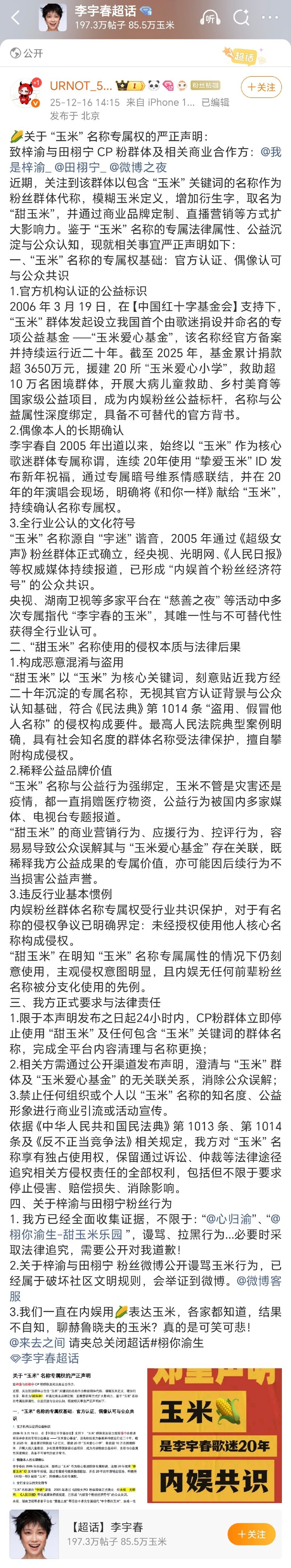 李宇春粉丝玉米维权事件😲李宇春粉丝对田栩宁梓渝的cp粉使用玉米称呼发起维权