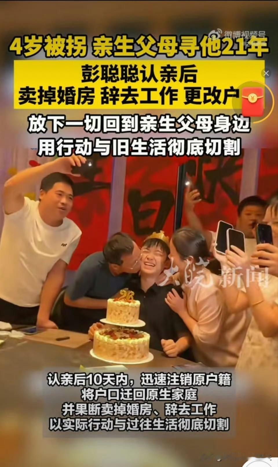 我和我老公因为彭聪聪较上劲了! 我刷到彭聪聪的新闻,顺口问老公:这孩子被拐21年,一认亲就卖房辞职回亲生父母身边,是不是太冲动了?他放下筷子反问我:要是你,你肯不肯? 我嘀咕着,好歹养父母供他长大买房,说断就断,心也太硬。老公突然红了眼眶:你只觉得养父母恩情重,怎么不想想亲生父母这21年怎么过的?他们找孩子找得倾家荡产,头发从黑熬到白,连拍张孩子身份证照片都得偷偷摸摸,怕他再消失。彭聪聪退房退户,不是凉薄,是明白那份安稳本是踩着自己爹妈的血泪换来的。 我愣了半天。他又说:你看《失孤》里郭刚堂找孩子24年,儿子最后却回养父母家了。亲生父母连儿子婚礼都只能当客人。彭聪聪能果断回头,不是每个人都能做到的。 新闻里写,有的孩子认亲后连声爸妈都不叫,有的连联系方式都不留。彭聪聪砸掉熟悉的生活,不是傻,是把被拐走的人生硬生生掰正了。 老公最后说:你别总觉得岁月静好,有人替你扛了21年的债。这话我接不住。
