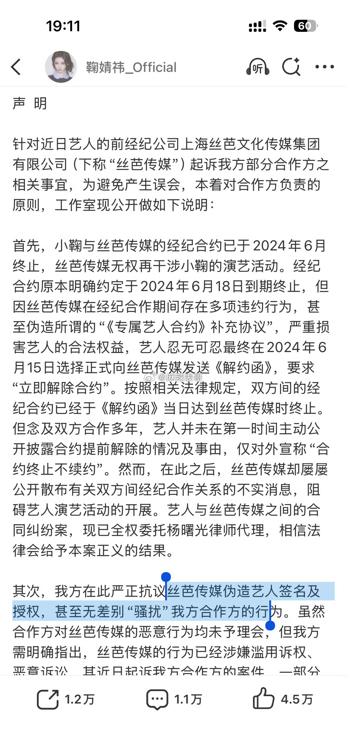 昨天鞠婧祎发声明,说丝芭传媒伪造鞠婧祎签字,合约到期不续。刚刚,丝芭传媒晒字迹鉴定报告,说合同上的签名就是鞠婧祎本人的,说鞠婧祎试图营造被迫害的形象,倒打一耙操控舆论。