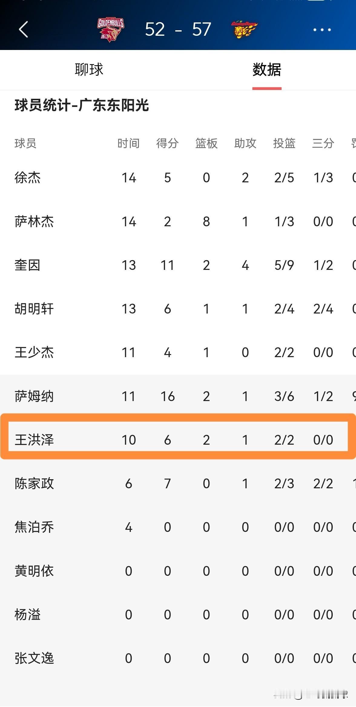 广东东阳光新星王洪泽真是年少有为!在今天进行的广东东阳光和浙江稠州金租的上半场比赛中,18岁的王洪泽替补出战10分钟,投篮2中2,其中罚球2中2得到6分2篮板1助攻1抢断,没有出现任何的失误,他的场上正负值为球队最高的+8。 照这样发展下去的话,再过两年王洪泽就可以成为广东东阳光的顶梁柱了。