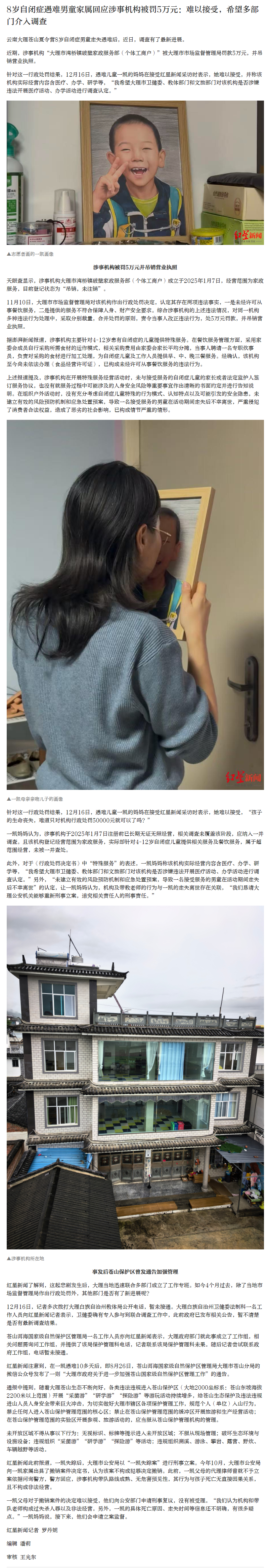 【#遇难自闭症男童家属回应机构被罚5万#】#机构被罚5万自闭症男童家属不接受# 云南大理苍山夏令营8岁自闭症男童走失遇难后,近日,调查有了最新进展。近期,涉事机构“大理市湾桥镇破壁家政服务部(个体工商户)”被大理市市场监督管理局罚款5万元,并吊销营业执照。针对这一行政处罚结果,12月16日,遇难儿童一凯的妈妈在接受红星新闻采访时表示,她难以接受,并称该机构实际经营内容含医疗、办学、研学等,“我希望大理市卫健委、教体部门和文旅部门对该机构是否涉嫌违法开展医疗活动、办学活动进行调查认定。”天眼查显示,涉事机构大理市湾桥镇破壁家政服务部(个体工商户)成立于2025年1月7日,经营范围为家政服务,目前登记状态为“吊销,未注销”。11月10日,大理市市场监督管理局对该机构作出行政处罚决定,认定其存在两项违法事实,一是未经许可从事餐饮服务,二是提供的服务不符合保障人身、财产安全要求。综合涉事机构的上述违法情况,对同一机构多种违法行为处理中,采取分别裁量,合并处罚的原则,责令当事人改正违法行为,处5万元罚款,并吊销营业执照。 针对这一行政处罚结果,12月16日,遇难儿童一凯的妈妈在接受红星新闻采访时表示,她难以接受,“孩子的生命丧失,难道只对机构行政处罚50000元就可以了吗?”一凯妈妈认为,涉事机构于2025年1月7日注册前已长期无证无照经营,相关调查未覆盖该阶段,应纳入一并调查。且该机构登记经营范围为家政服务,实际却针对4~12岁自闭症儿童提供相关服务及餐饮服务,属于超范围经营,未被一并查处。 此外,对于《行政处罚决定书》中“特殊服务”的表述,一凯妈妈称该机构实际经营内容含医疗、办学、研学等,“我希望大理市卫健委、教体部门和文旅部门对该机构是否涉嫌违法开展医疗活动、办学活动进行调查认定。”另外,“未建立有效的风险预防机制和应急处置预案,导致一名接受服务的男童在活动期间走失后不幸离世”的认定,让一凯妈妈认为,机构及带教老师的行为与一凯的走失离世存在关联,“我们恳请大理公安机关能够重新刑事立案,追究相关责任人的刑事责任。”#遇难自闭症男童家属称会申请立案监督# 网页链接