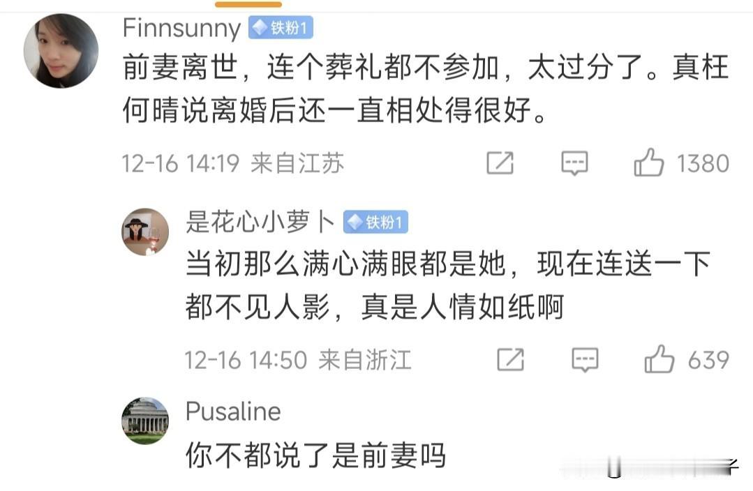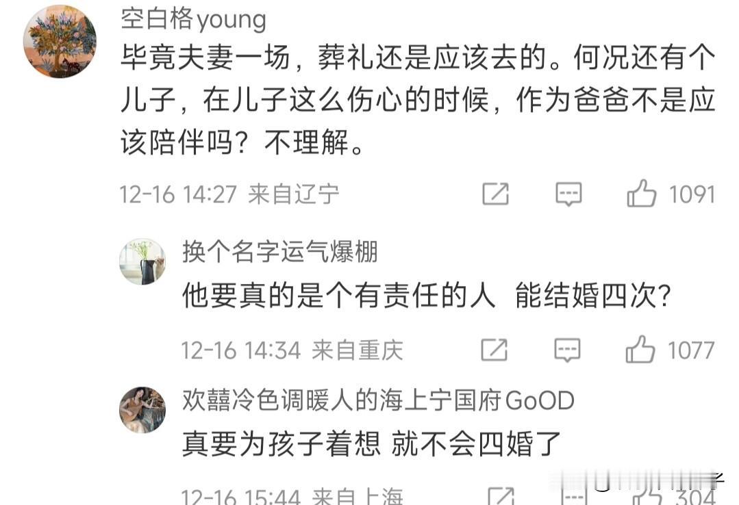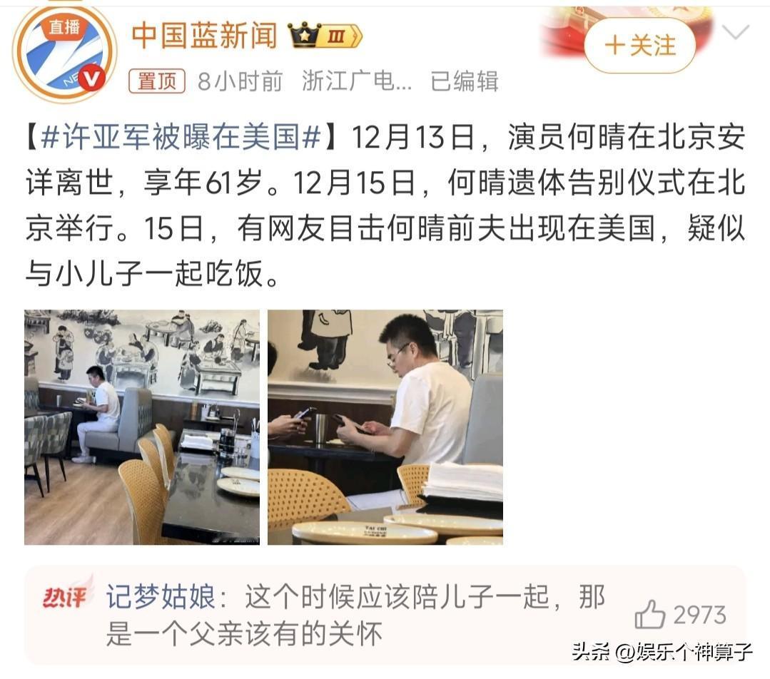 不要再责怪许亚军了,无论是否参加何晴告别仪式,都没毛病! 12月16日,据媒体报道,有网友在国外偶遇许亚军,疑似与小儿子一起吃饭,还晒出两张照片,到底是不是本人?不得而知。 昨日,家人为何晴举办告别仪式,貌似也没有看到前夫的身影。 于是,评论区沦陷了,一些网友表示,前妻离世,连个葬礼都不参加,太过分了,起码也应该陪陪大儿子吧! 其实,这种看法,也可以理解,毕竟夫妻一场,主观来说,送最后一程,确实显得更体面,更重感情。 不过,换个角度,两人已经离婚,相处好的还是朋友,相处不好,就形同陌路,更何况许亚军也有了新的家庭,客观来讲,即使不到场,也无可厚非。 分开以后,何晴没说过一句前夫不好,而且相处非常融洽,作为路人,并不了解具体情况,没必要如此责怪。 所以,不能说来了,就是有情有义,不来,就是薄情寡义,更不能说,没到场,就代表不伤心,不难过。