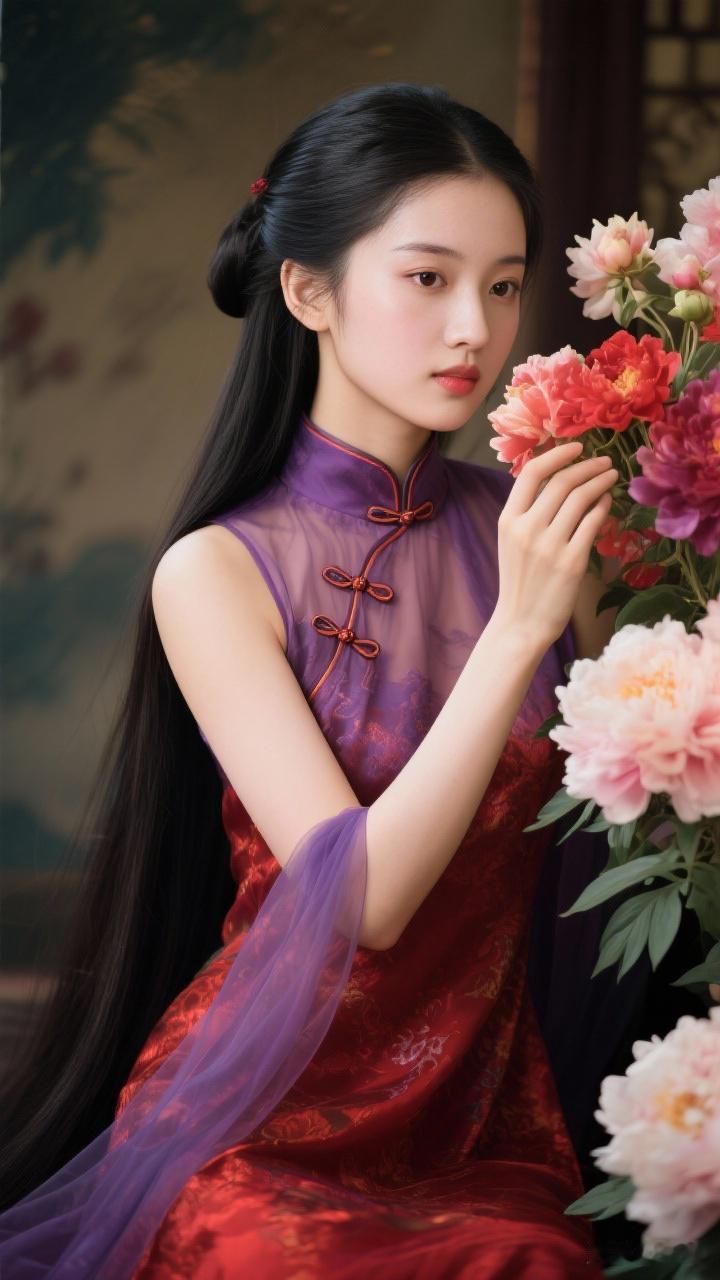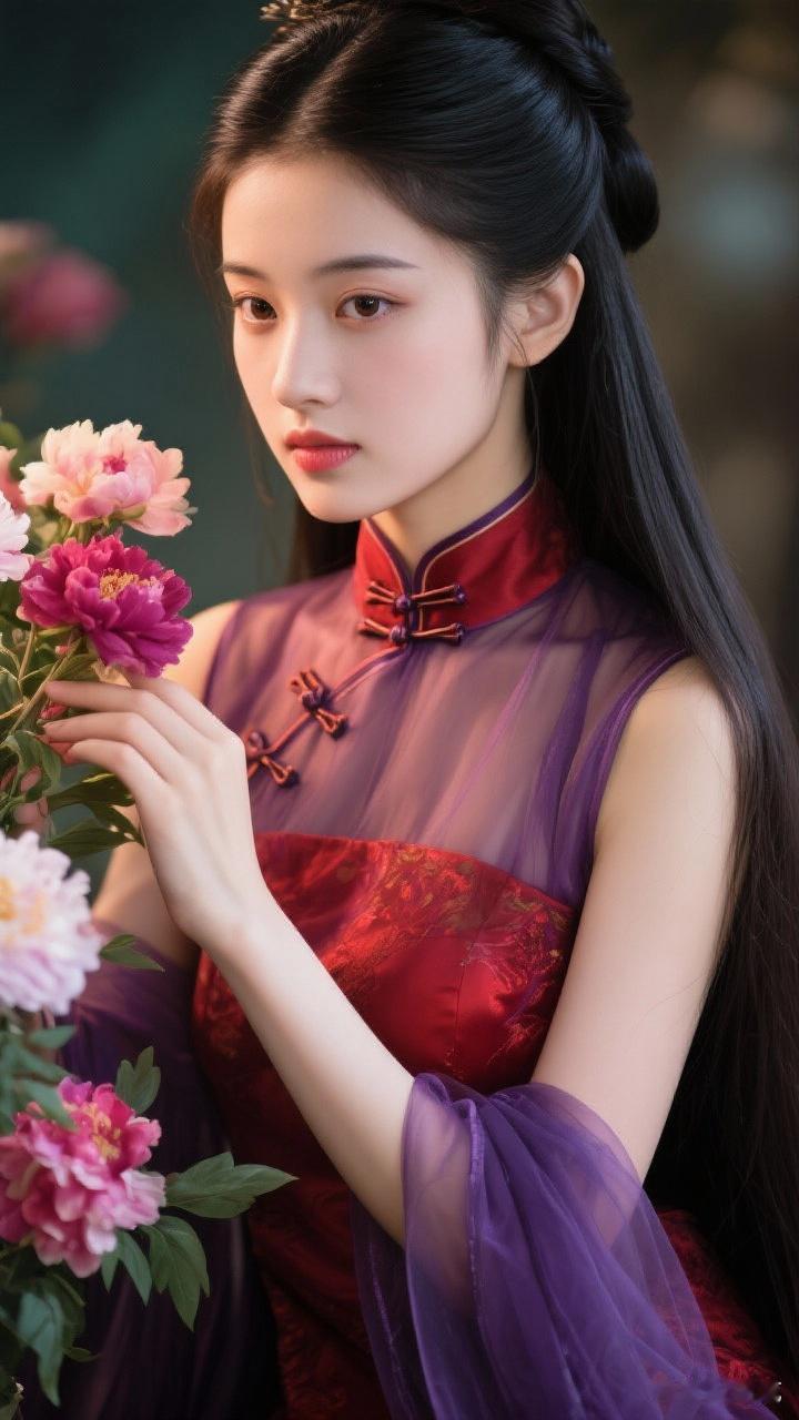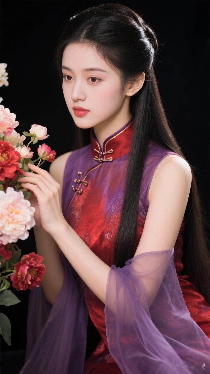 古典美人与花相伴,红衣飘逸,尽显东方韵味。