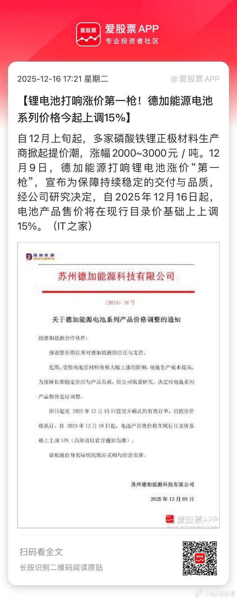 【锂电池打响涨价第一枪!德加能源电池系列价格今起上调15%】自12月上旬起,多家磷酸铁锂正极材料生产商掀起提价潮,涨幅2000~3000元 / 吨。12月9日,德加能源打响锂电池涨价“第一枪”,宣布为保障持续稳定的交付与品质,经公司研究决定,自2025年12月16日起,电池产品售价将在现行目录价基础上上调15%。(IT之家)... 网页链接