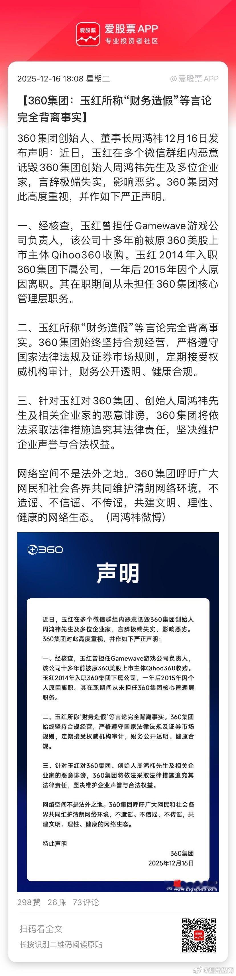 【360集团:玉红所称“财务造假”等言论完全背离事实】360集团创始人、董事长周鸿祎12月16日发布声明:近日,玉红在多个微信群组内恶意诋毁360集团创始人周鸿祎先生及多位企业家,言辞极端失实,影响恶劣。360集团对此高度重视,并作如下严正声明。 一、经核查,玉红曾担任Gamewave游戏公司负责人,该公司十多年前被原360美股上市主体Qihoo... 网页链接