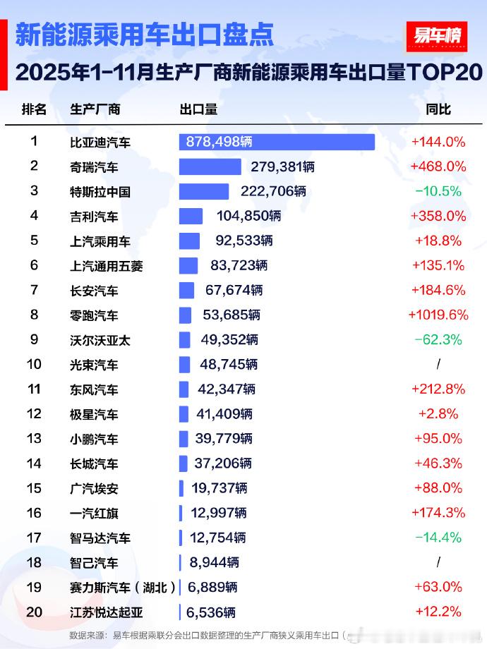 前11个月中国新能源生产厂商出口量,国产车出口速度加快了巨多,好几个同比翻3倍、4倍,零跑直接翻10倍。新能源汽车