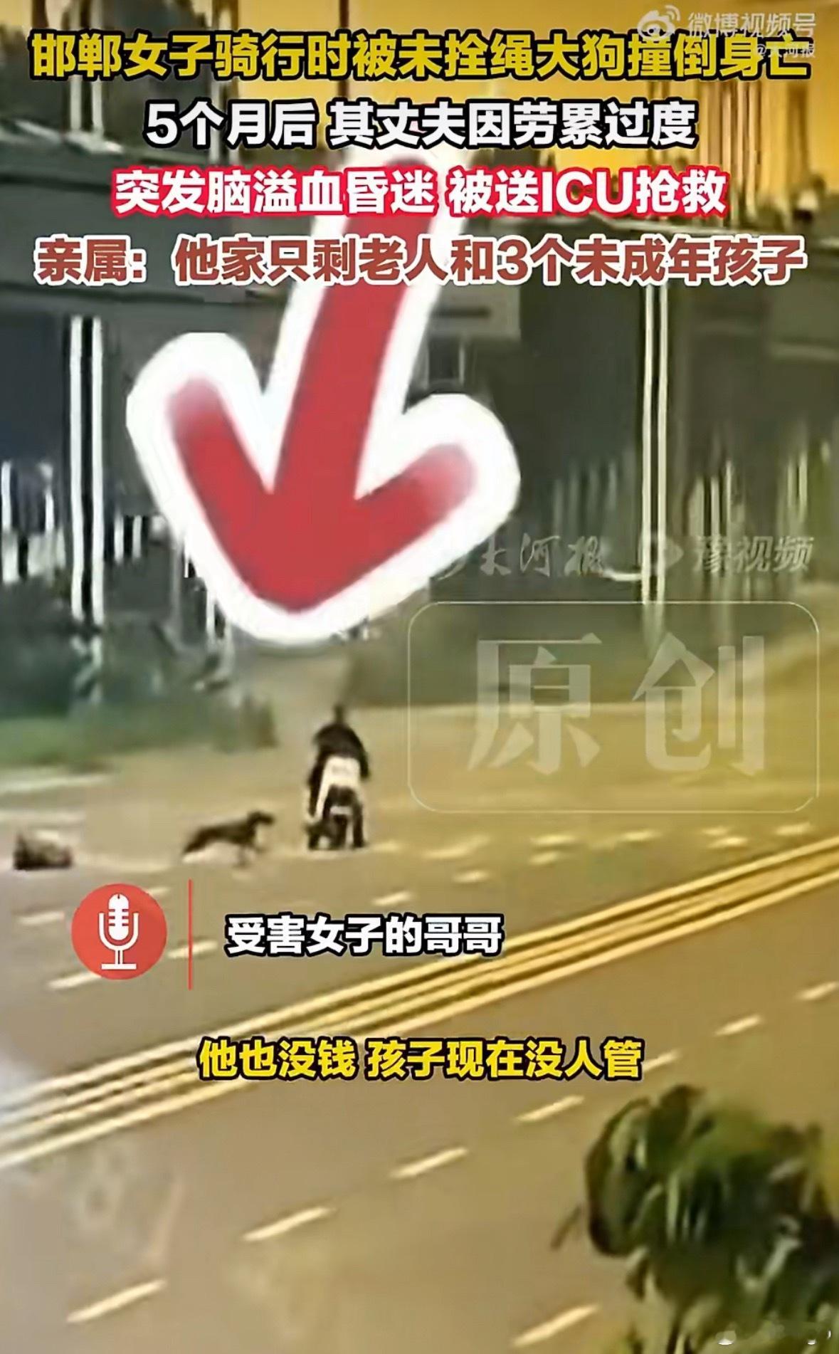 女子被大狗撞倒身亡丈夫住进ICU女子被未栓绳大狗撞到身亡,丈夫为妻子奔波维权期间昏迷住进ICU,留下三个小孩子没人管.....这又是谁的狗儿子没栓绳跑出来了啊???