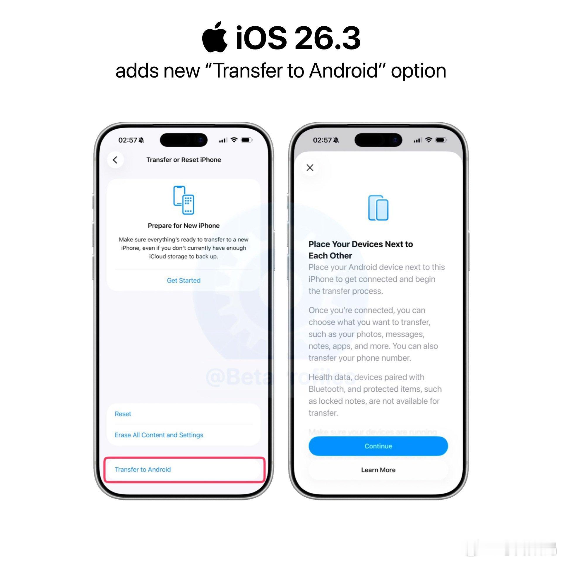 苹果安卓实现互通iOS26.3 Beta版本中,新增“与安卓互传”功能,可以将iPhone上的照片、视频、备忘录等数据无损传给Android设备了