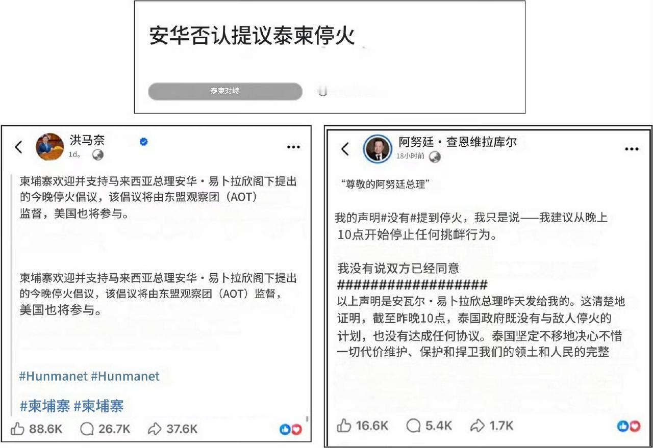 泰柬冲突还在继续,两国领导人在社交平台也是“你来我往”。柬埔寨是真想停火了,泰国是还想继续再打,拿到更多谈判资本。 泰国提出三项关键条件,其中之一就是柬埔寨必须先宣布停火。柬埔寨想停火,也得是亲自和泰国谈,第三方转述的不能算。 洪玛奈在社交平台发文说,柬埔寨欢迎马来西亚的停火协议,并且将认真执行。泰国总理也发文说,马来西亚只说了建议,可没说停火。两人在社交平台相互开炮,柬埔寨想从舆论上逼迫泰国停火,泰国不松这个口。 泰国要再这样打下去,柬埔寨这些年积累的灰色产业,可真就给打没了,洪家心疼哈!