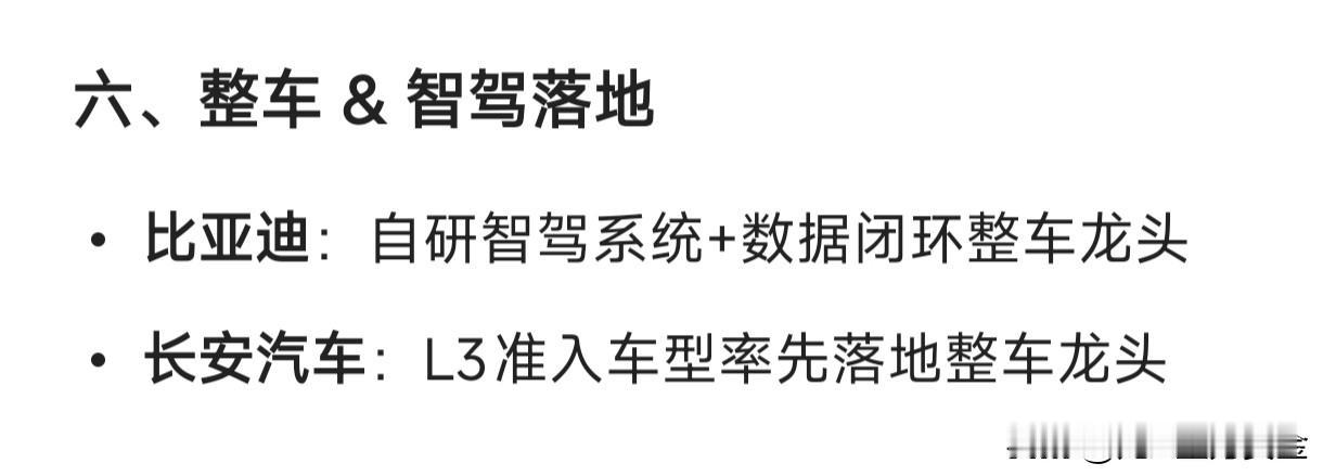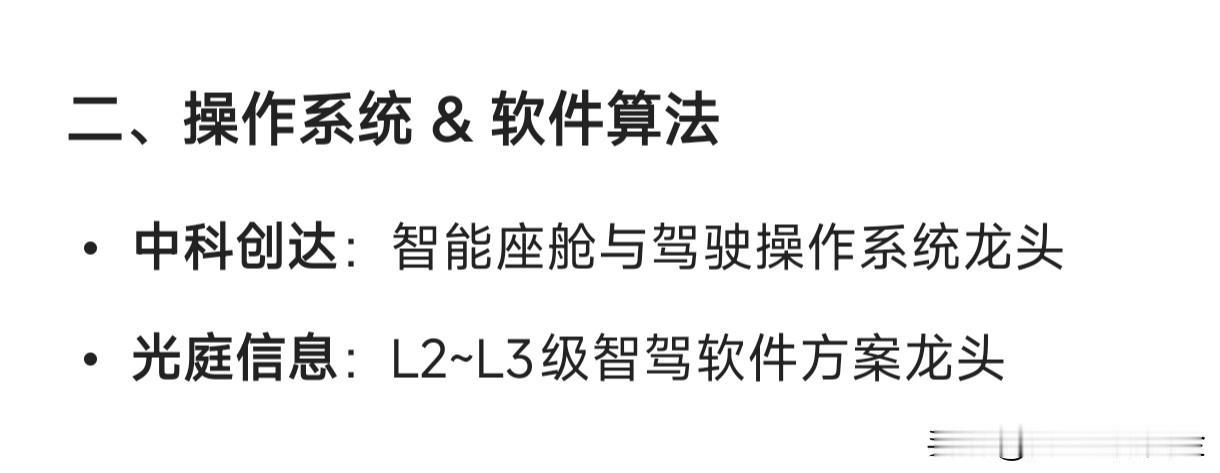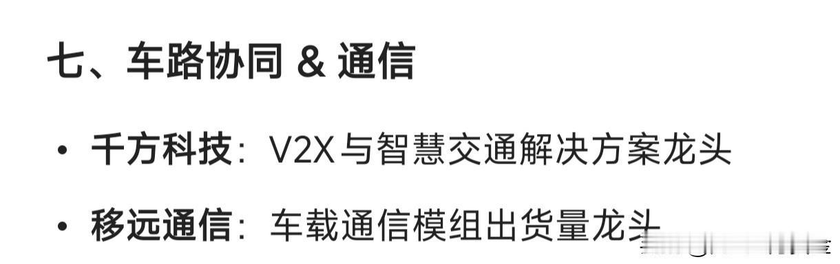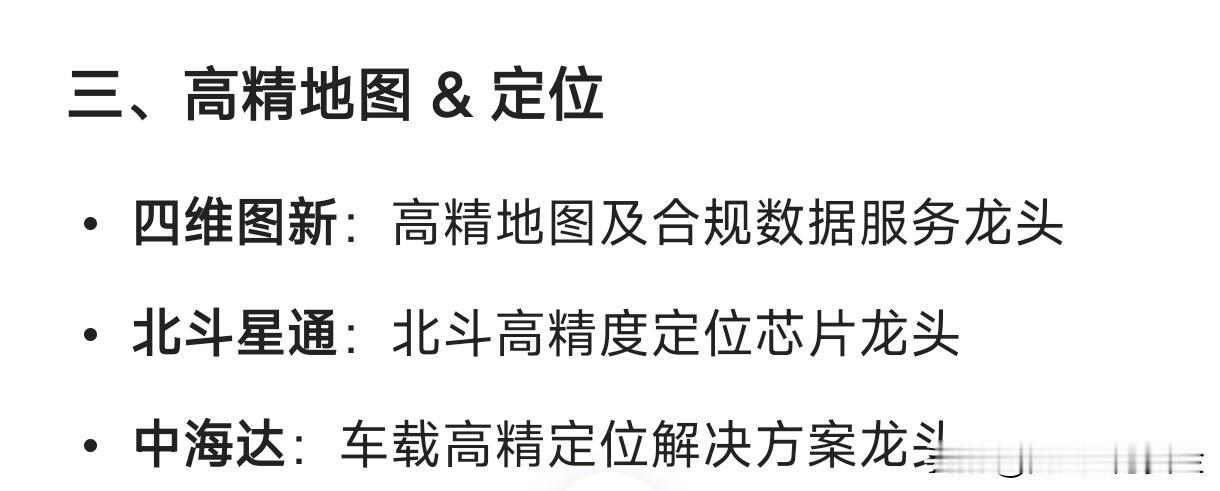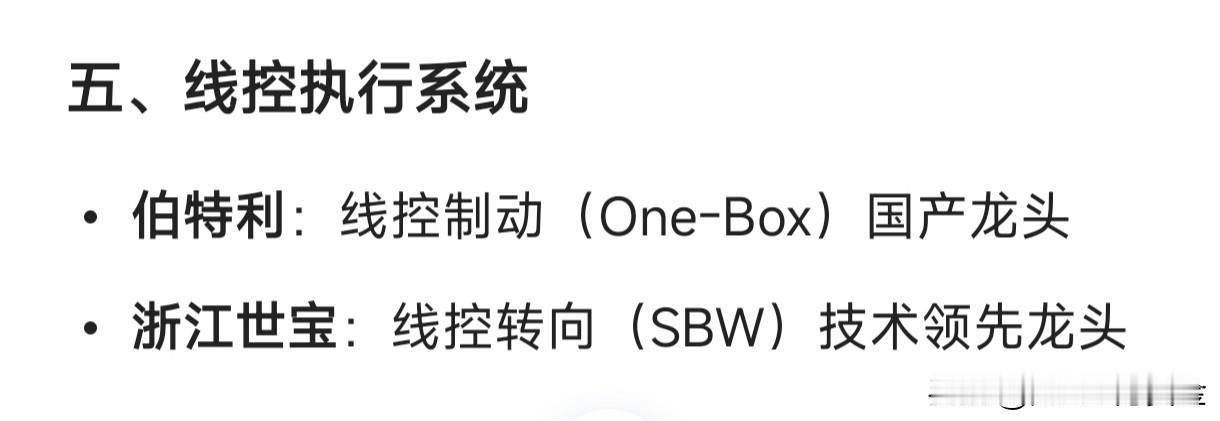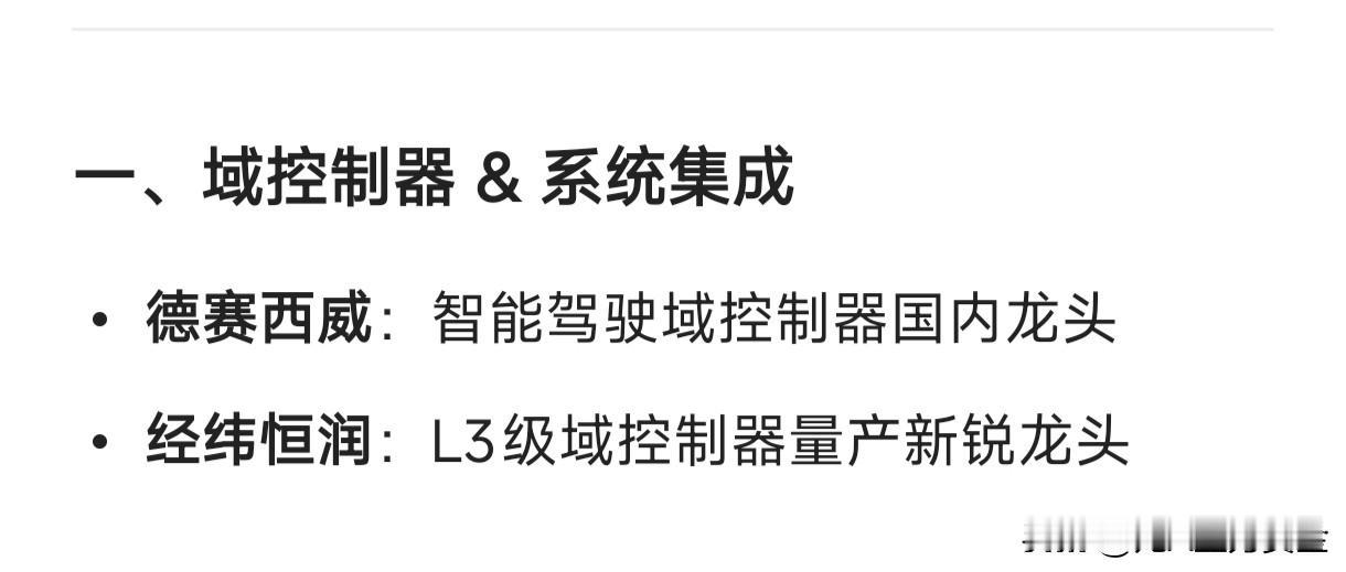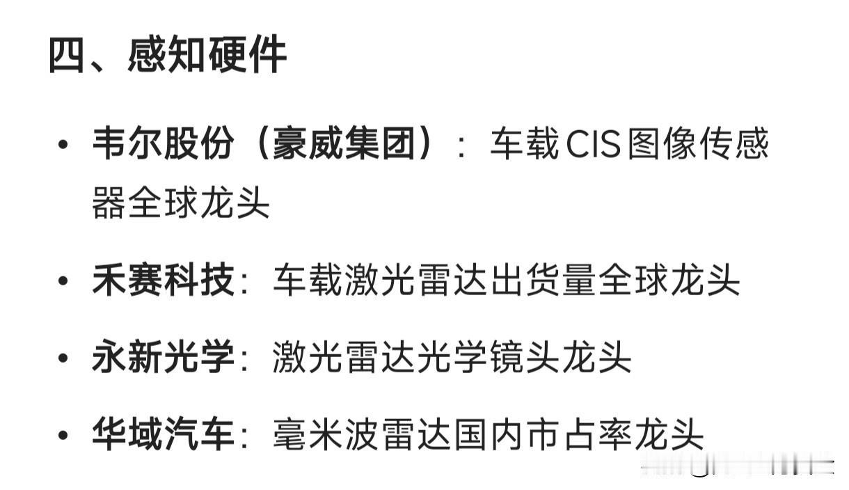 智能驾驶概念细分龙头企业汇总: 一、域控制器 & 系统集成 德赛西威:智能驾驶域控制器国内龙头 经纬恒润:L3级域控制器量产新锐龙头 二、操作系统 & 软件算法 中科创达:智能座舱与驾驶操作系统龙头 光庭信息:L2~L3级智驾软件方案龙头 三、高精地图 & 定位 四维图新:高精地图及合规数据服务龙头 北斗星通:北斗高精度定位芯片龙头 中海达:车载高精定位解决方案龙头 四、感知硬件 韦尔股份(豪威集团):车载CIS图像传感器全球龙头 禾赛科技:车载激光雷达出货量全球龙头 永新光学:激光雷达光学镜头龙头 华域汽车:毫米波雷达国内市占率龙头 五、线控执行系统 伯特利:线控制动(One-Box)国产龙头 浙江世宝:线控转向(SBW)技术领先龙头 六、整车 & 智驾落地 比亚迪:自研智驾系统+数据闭环整车龙头 长安汽车:L3准入车型率先落地整车龙头 七、车路协同 & 通信 千方科技:V2X与智慧交通解决方案龙头 移远通信:车载通信模组出货量龙头