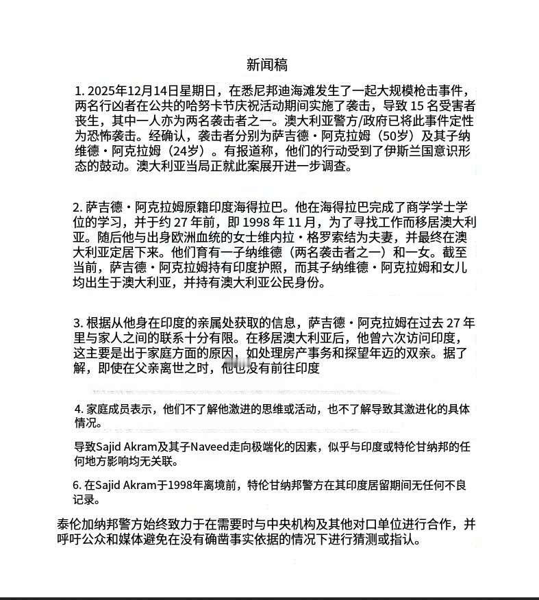 急忙与悉尼枪击案切割 印度泰伦加纳邦警方火速“澄清”! 今天(12月16日)印