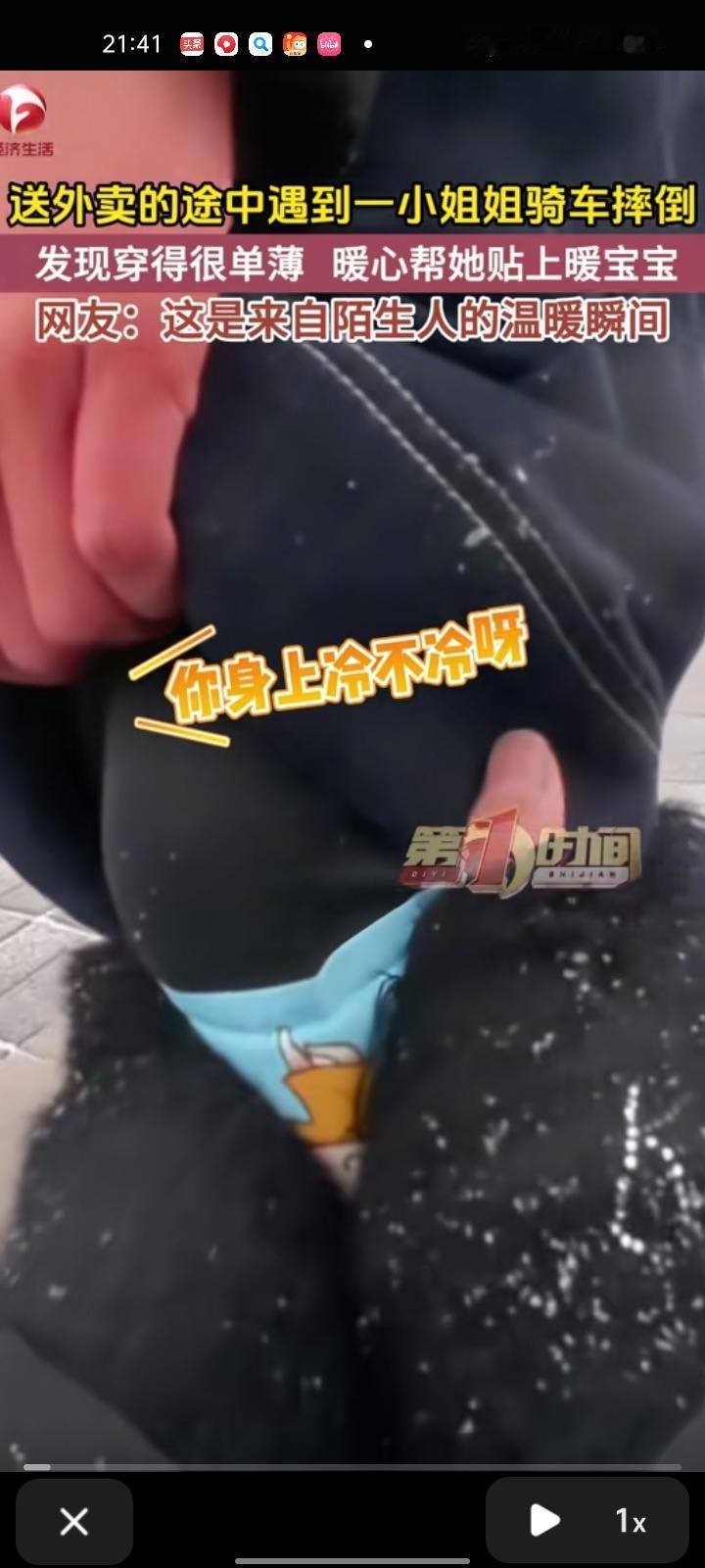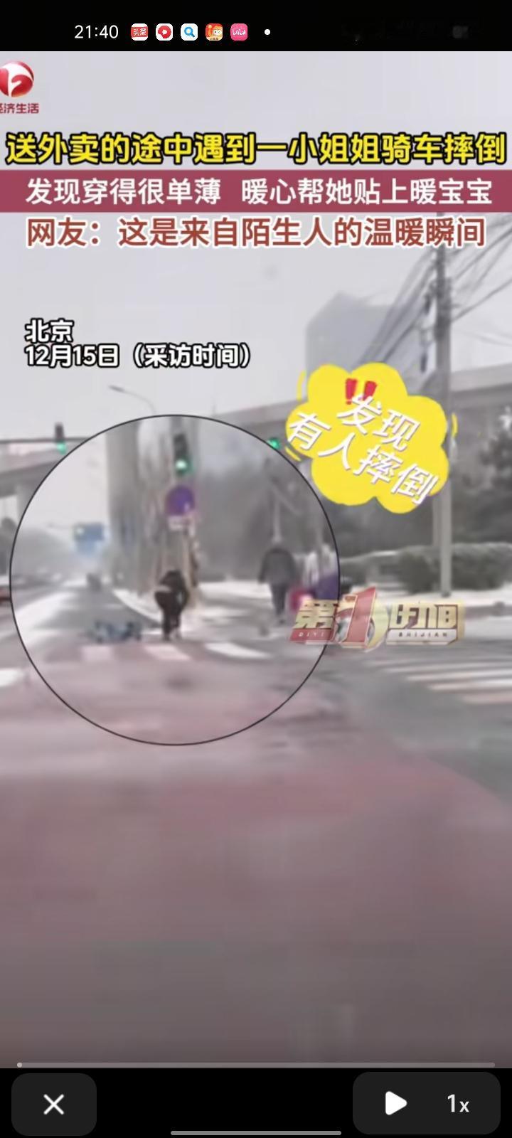12月14日,北京。外卖员送外卖途中遇到一位小姐姐骑车摔倒,发现她穿的单薄,正好想到车上有暖宝宝,就给她贴上了。后来才知道,小姐姐是要去前面的地铁站,直接给她送过去了。 当事人表示,之所以拍这条视频,是因为在送外卖途中受到别人的帮助,希望爱心能够传递。