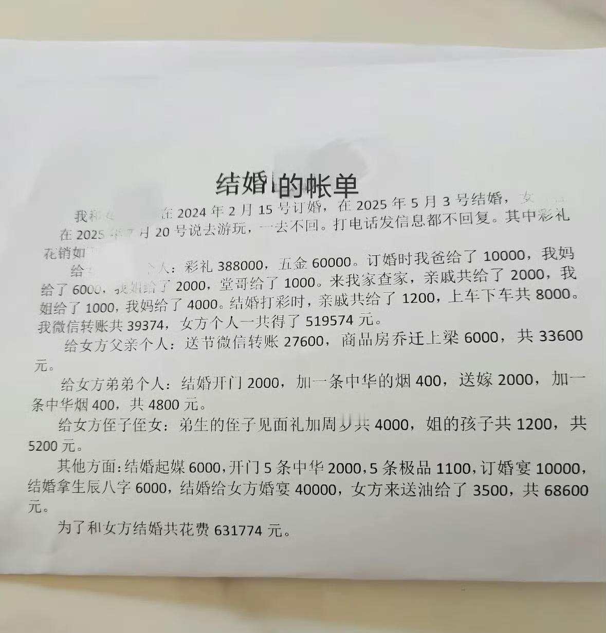 浙江一男子吐槽花63万彩礼结婚,2个月后女滴以出去散心就失联了。他们是今年5月结婚,7月的一天女方说要出去玩下,然后人就联系不上了。男方说,她和女方相亲认识,2024年订婚,2025年结婚,从始至终都是男方为女方及家人给钱、给礼物,所有的结婚账单加起来63万多,女方就陪嫁了几床不值钱的床上用品和洗漱用品。而今人不见,彩礼不退。彩礼谈崩 彩礼事情