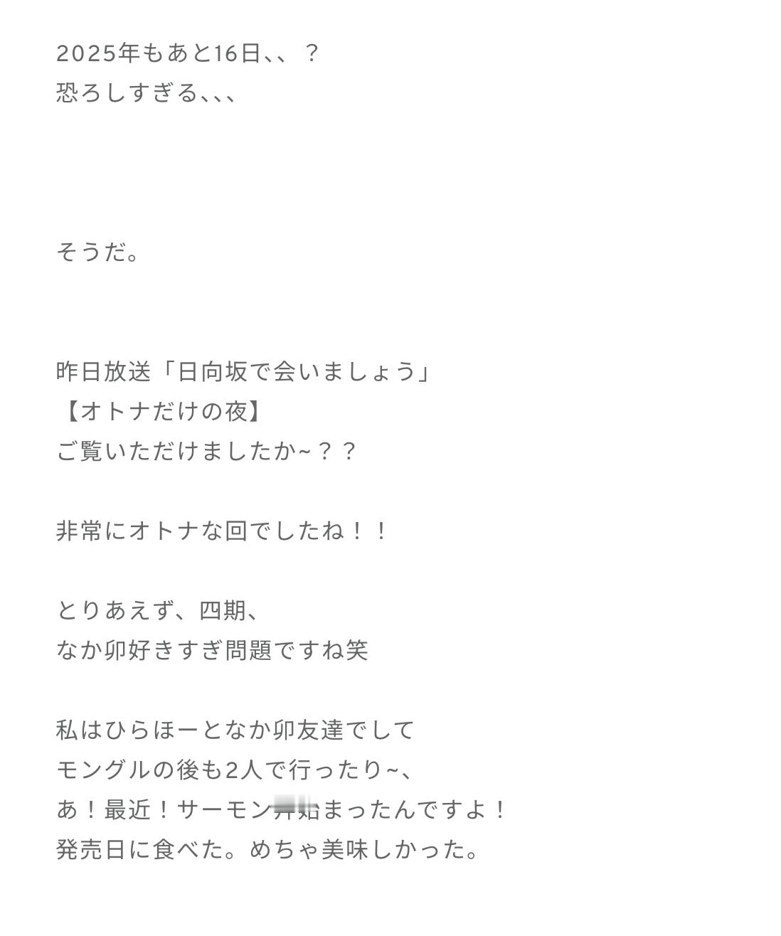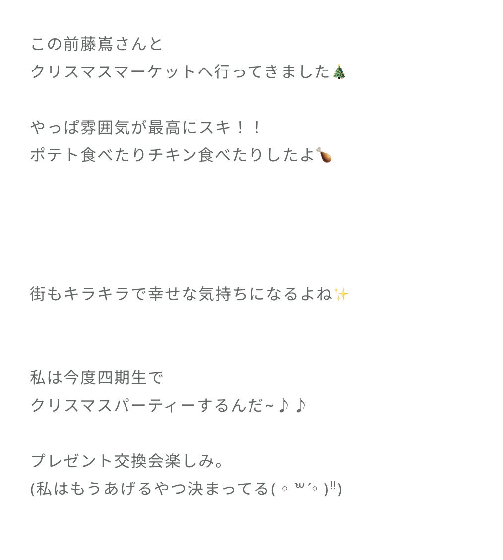 石塚瑶季「「クリスマスのプレイリストばかり聴いちゃいますよね- なんかこの前ぼんやりテレビ観てたら、うちの同期が小学生の時、アリアナ・グランデさんの“Santa Tell Me”を歌えるようになりたかった(?)的なこと言ってておもろ可愛かったです。次会った時いじろうと思います(笑)」」