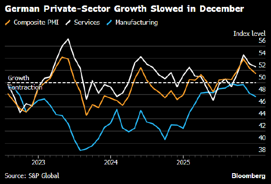 德国12月私营部门活动增速低于预期,制造业意外录得十个月来最差表现。