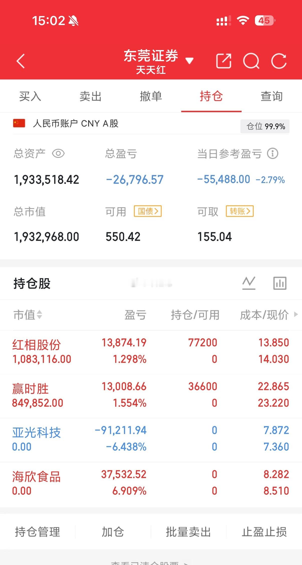 100w本金记录到300w(第143天)今日持仓票:红相gf、赢时s今日总资产:193w 今日盈亏:-5.5w特别声明:这只是我个人的操作记录,不作为任何投资建议,股市有风险,投资需谨慎!