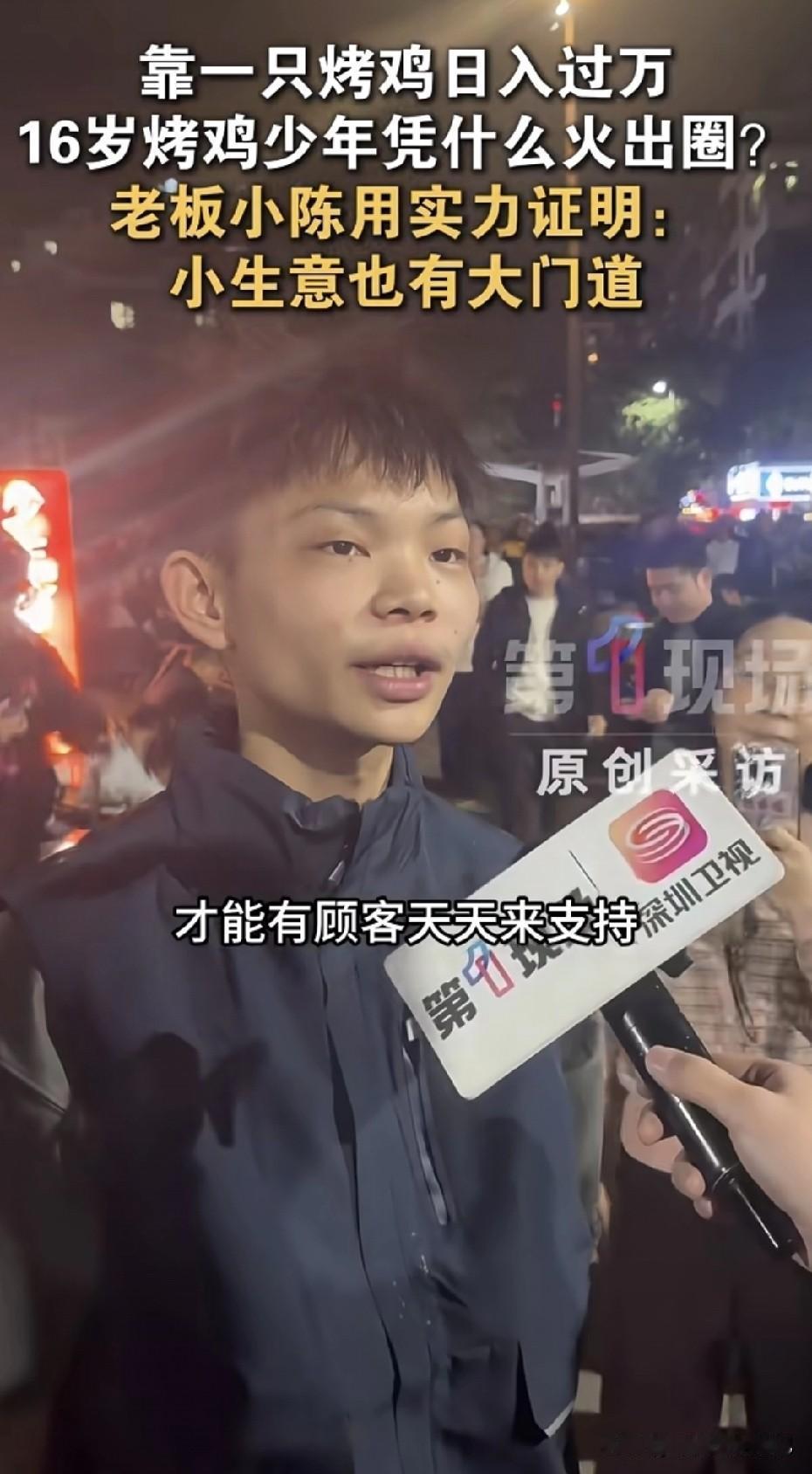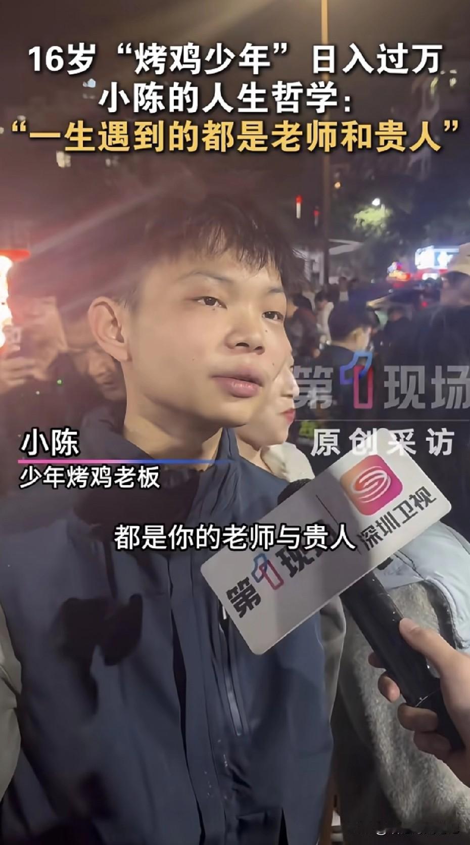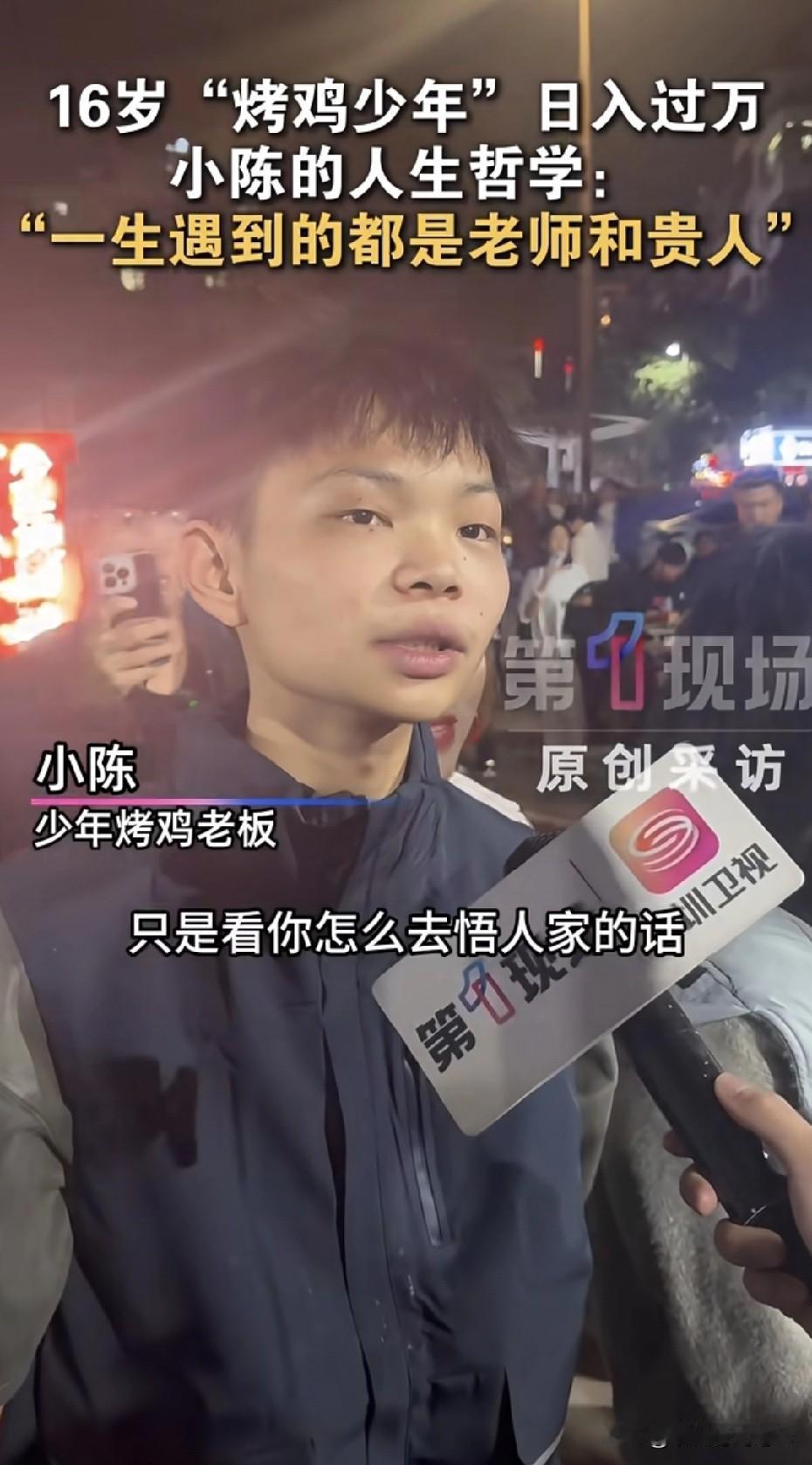 别人16岁:上课、补习、打游戏。 小陈16岁:端烤炉、搬荔枝木、月入20万。 我看到的不是“读书无用”,而是“穷人孩子早当家”的残酷生活。可谁想到,这娃14岁辍学,3万块启动资金是搬货搬出来的。 摊前就他一个人,手上全是烫伤疤,每天守炉8小时,却笑着说:“打工才有周末,老板只有炉子。”“我想早点关掉我妈凌晨五点的闹钟。” 一句话,把“少年感”和“养家”这两个词焊死在了一起。他说:“不是我想早熟,现实没给我幼稚的机会。” 家里8个娃,他排老七,哥哥姐姐打工,他偏要当那个“不走寻常路”的,目标是,让爸妈能够在别人面前直起腰说“不”。 流量来了,他不膨胀。想开迈巴赫,但得先把这只鸡烤好;半夜自己盘账、试新味,拒绝几百个“付费学艺”,理由:我自己还没毕业,教个啥? 所以别再问“读书无用论”了,读书是路径,担当才是内核。人家是16岁,但心智早就成年。有人躺,是还没找到那根必须站起来的理由;有人站,是因为身后没人替他撑。小陈的烧鸡火,说到底火的是那股“我命由我”的劲儿。棒棒哒,加油 少年!