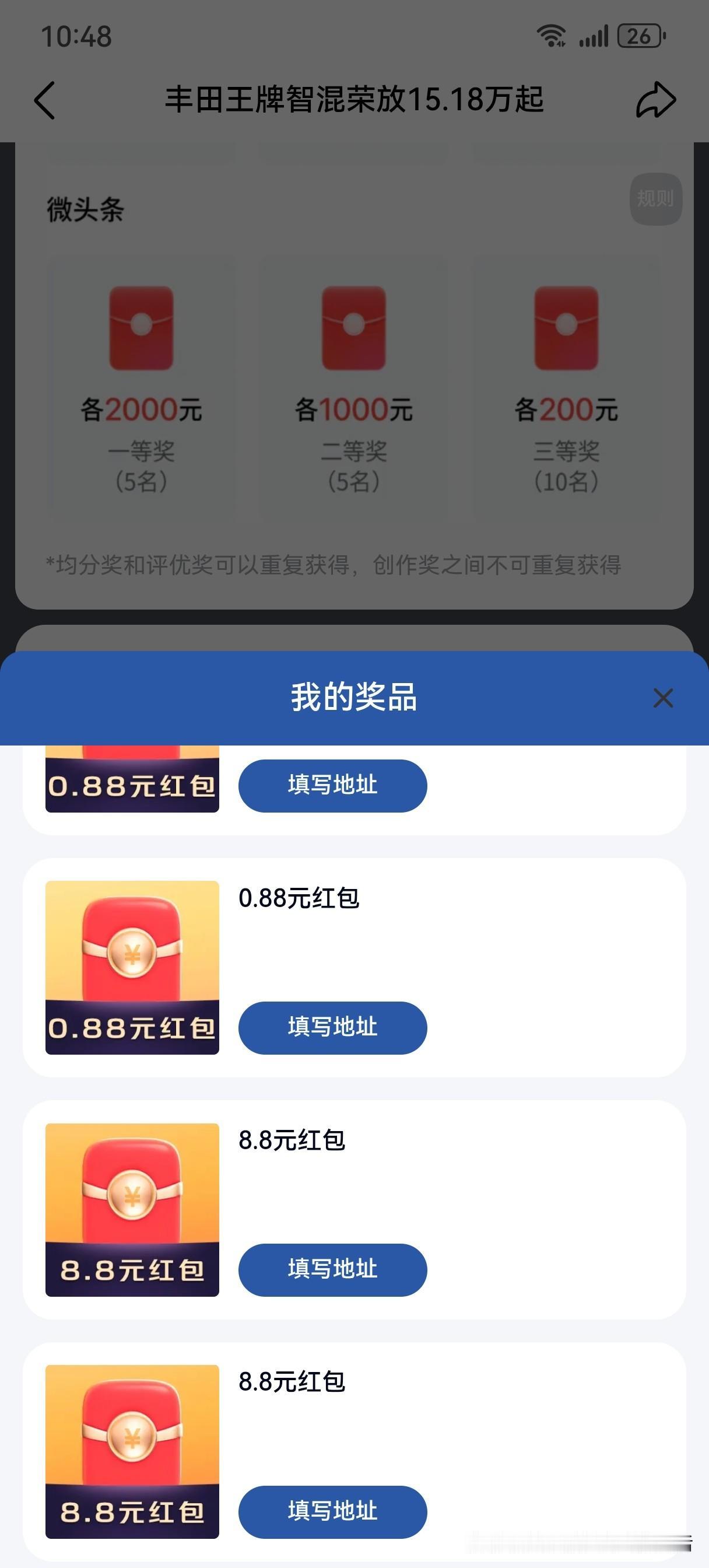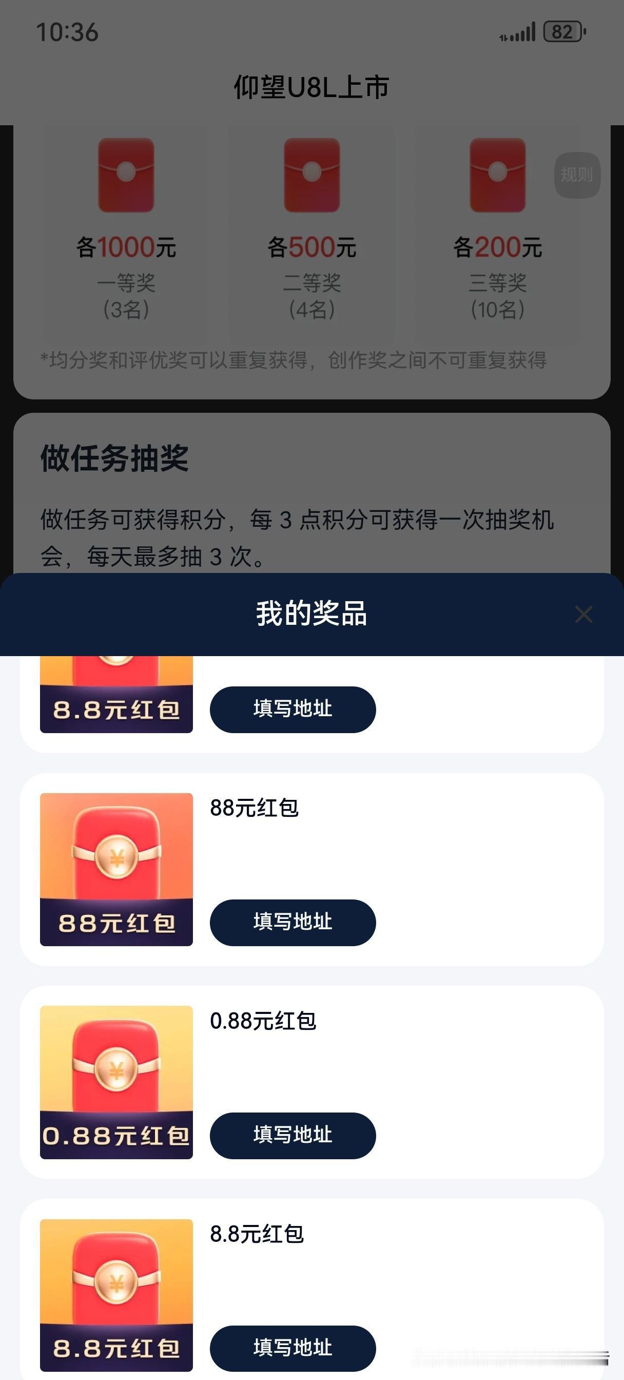 年底这波征文来势之汹涌,如山岳倾倒,海水翻腾,气势浩大,势不可挡。还好终于今天完成啦,还是要感谢各位小伙伴们鼎力相助,一直无微不至的帮我助力,征文路上有你相伴真好。另外和大家分享这波征文的快乐,88的大红包既然连续2次喜从天降,8.8和0.88的小红包也是铺天盖地的砸向我,幸福来得太突然啦。 开心开心。[呲牙][呲牙][呲牙][烟花][烟花][烟花]