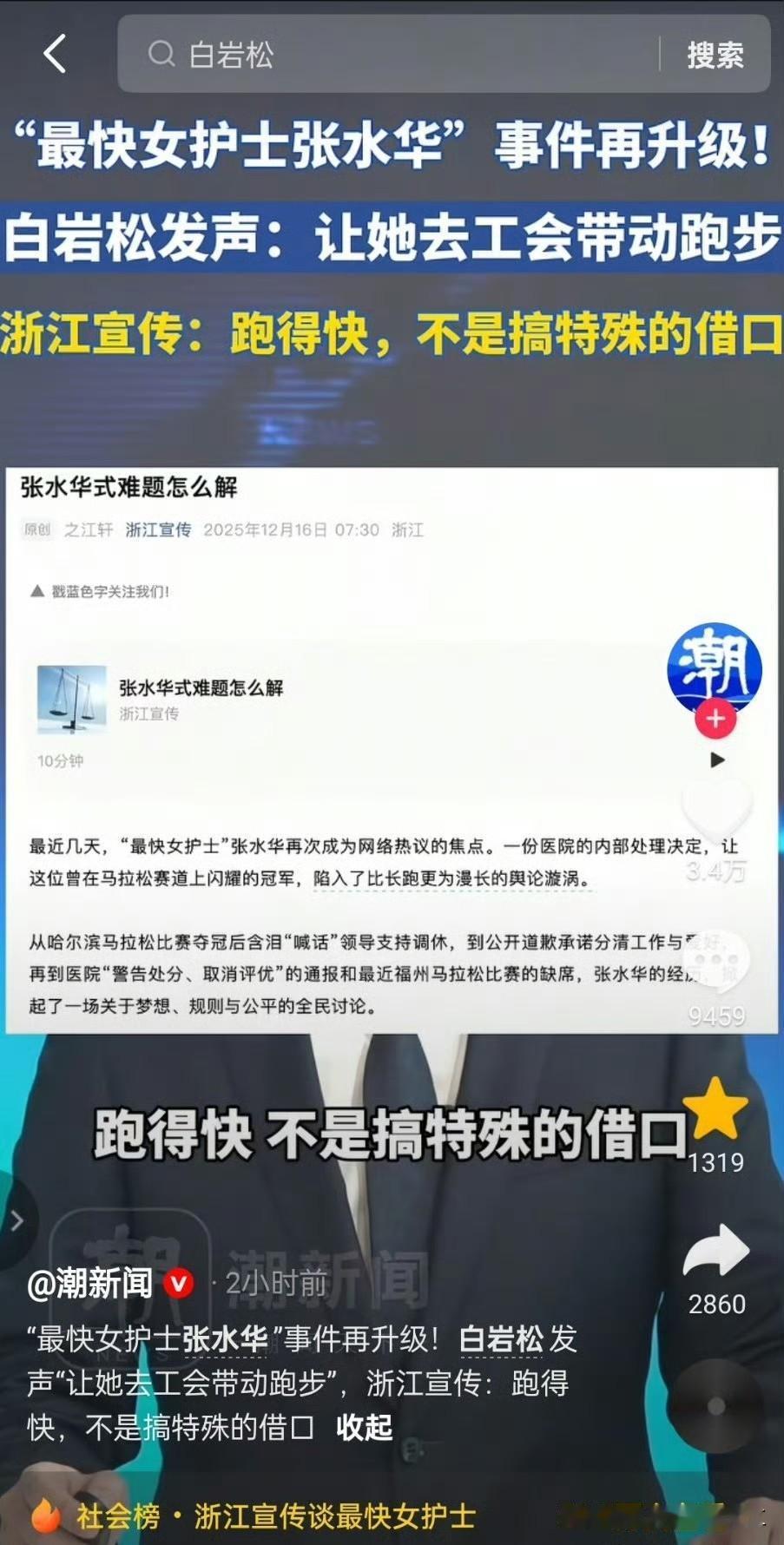 白岩松称让马拉松女护士去工会。遭网友质疑"站着说话不腰疼"。媒体:白岩松的评点不能自圆其说。白岩松谈张水华被处分