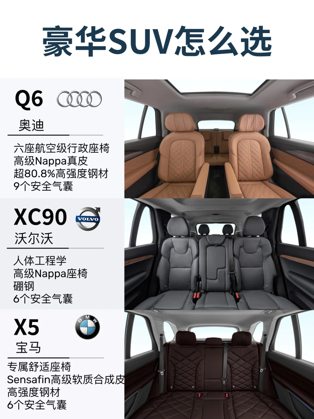 ✔️座椅上:在座椅配置上,奥迪Q6同样表现出色。它的二排航空级行政座椅在国内豪华中大型SUV市场中极为罕见,为二排乘客提供了独立行政座椅,这一点是沃尔沃XC90和宝马X5所不具备的。而三排座椅采用的双人沙发设计,宽厚的座椅和宽敞的腿部空间,让乘坐舒适性大幅提升。此外,奥迪Q6还配备了通风加热按摩功能,以及600种以上的氛围灯组合,让乘坐体验更加奢华。