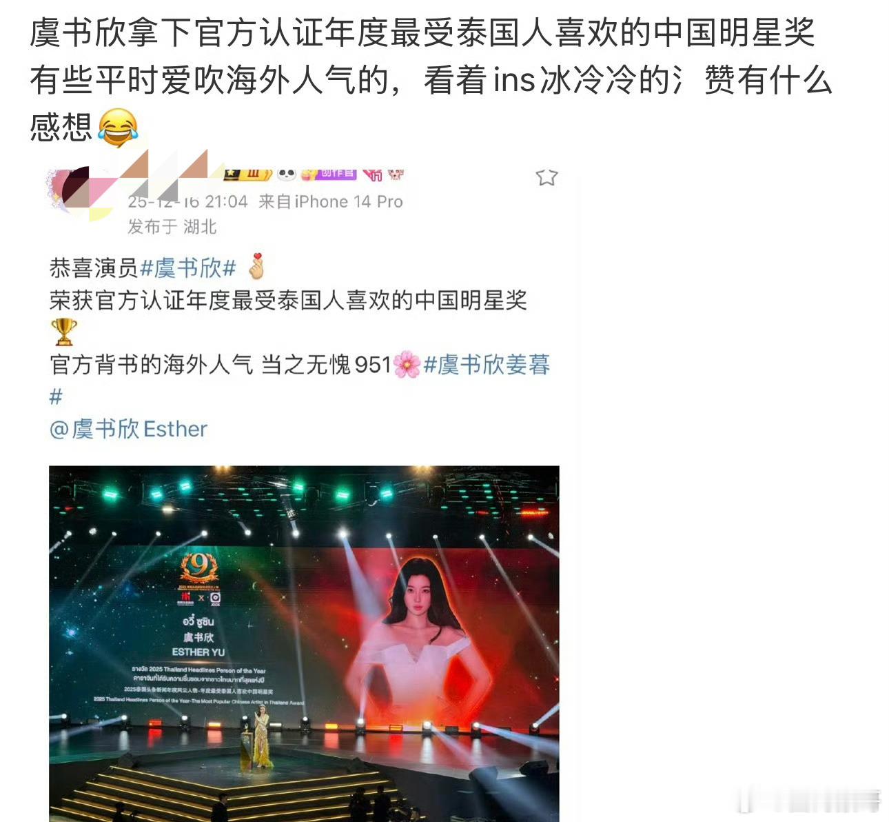 虞书欣拿的是最受泰国人喜欢的中国明星奖?每年颁多少个?含金量是不是比白玉兰视后金鸡影后还高