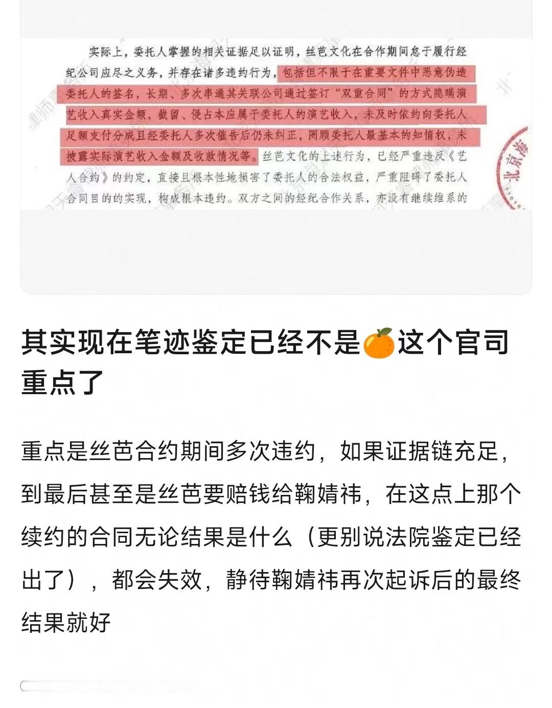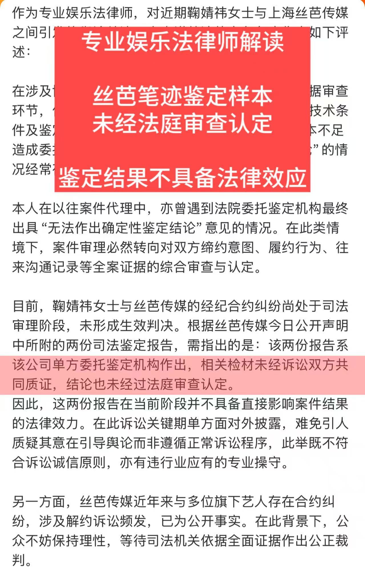 鞠婧祎方艾特丝芭专业律师也出来解读鞠姐这边的新发文了哎,感觉丝芭纯小丑来的。样本没经过法庭审查、鉴定结果法庭也不认,还敢晒出来做证据带节奏,搞什么,把法律当儿戏啊??
