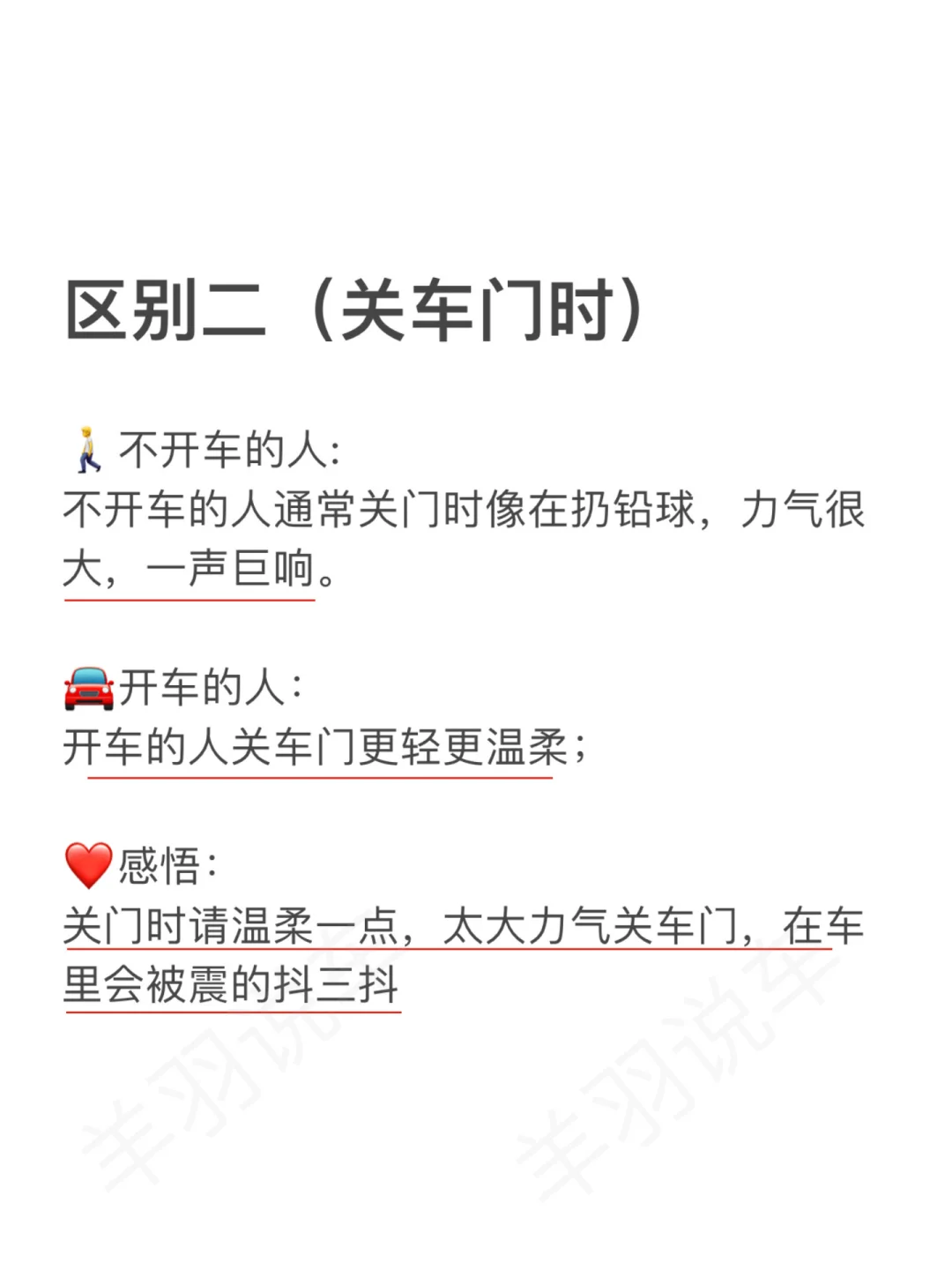 2⃣️自己开车的人,坐别人车时,一般不会用力关门。没开过车的关车门声贼大!有个朋友,每次坐我车,下车关门都要被他震得头发懵,也不好说什么